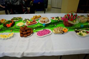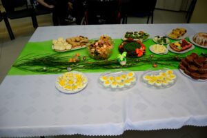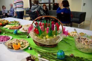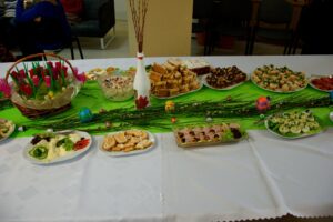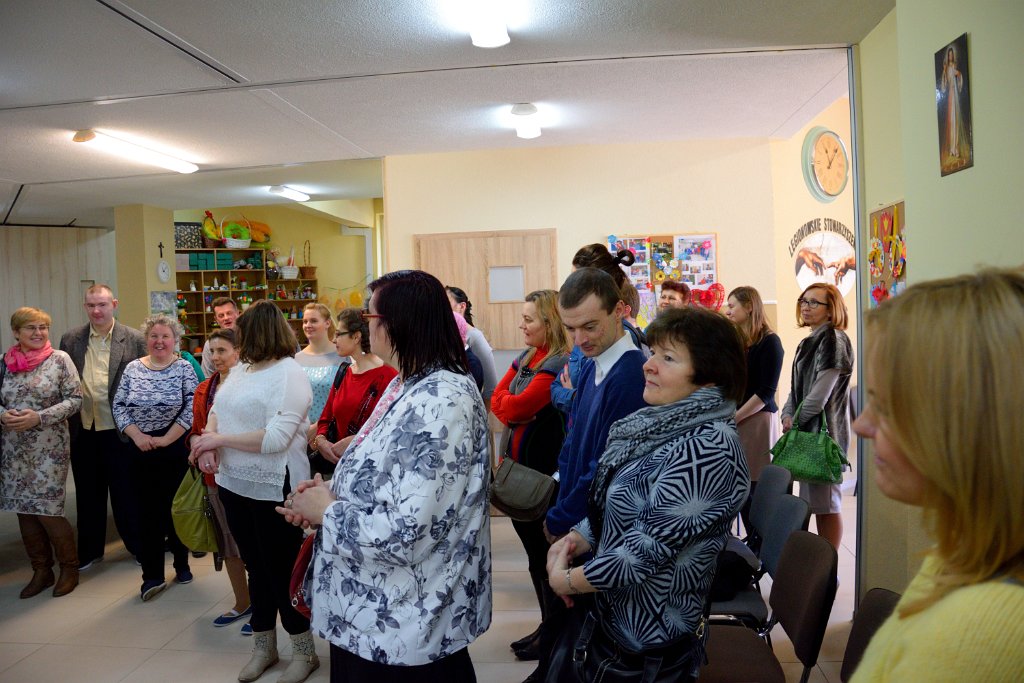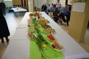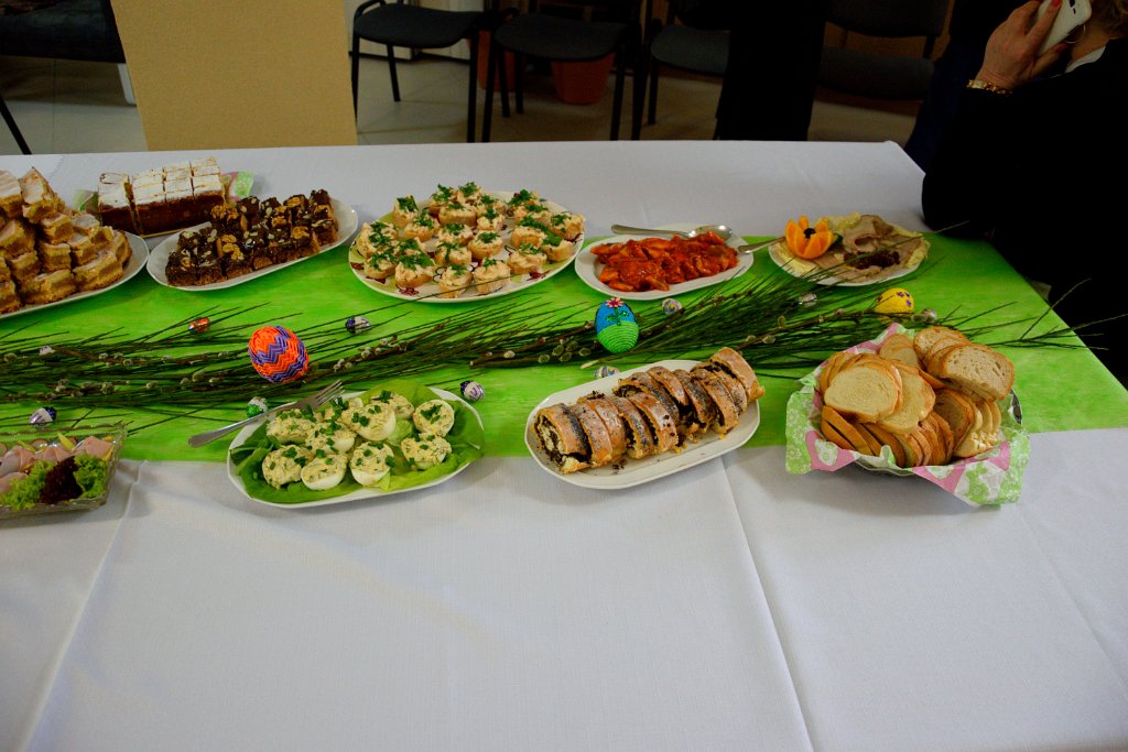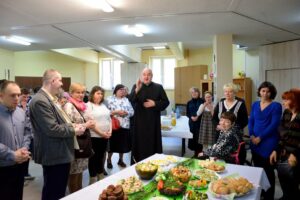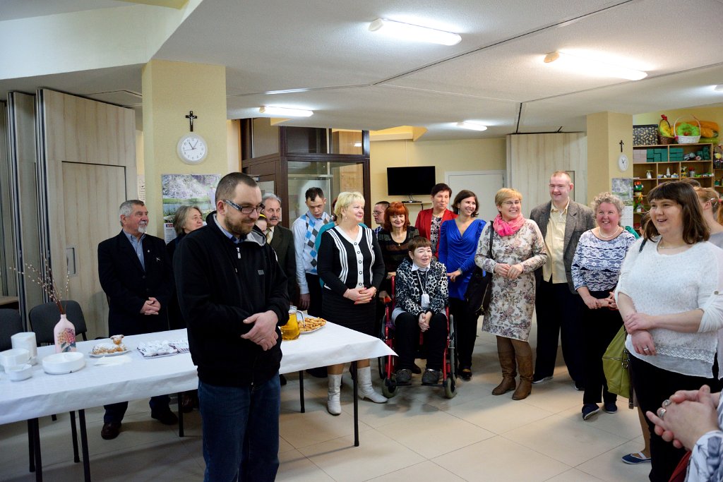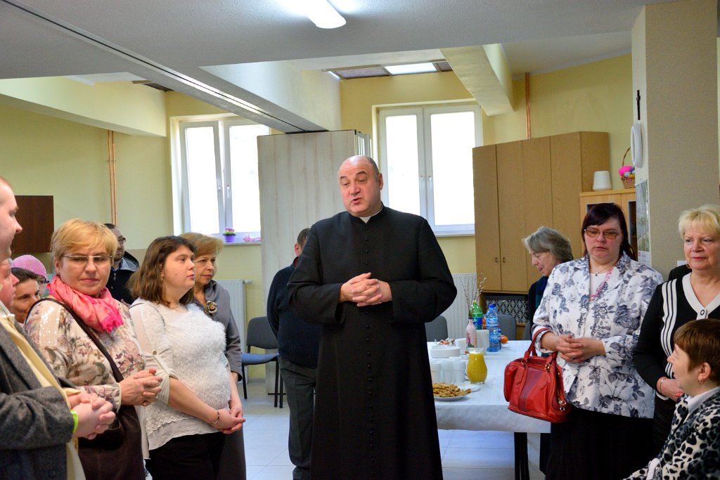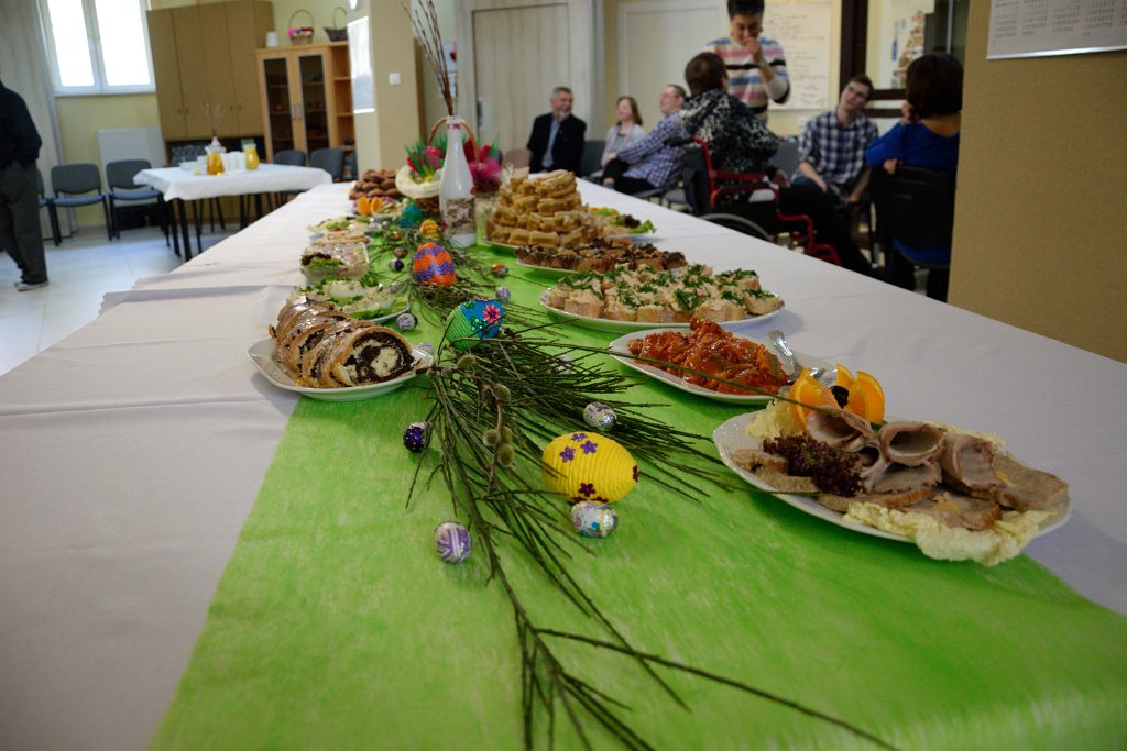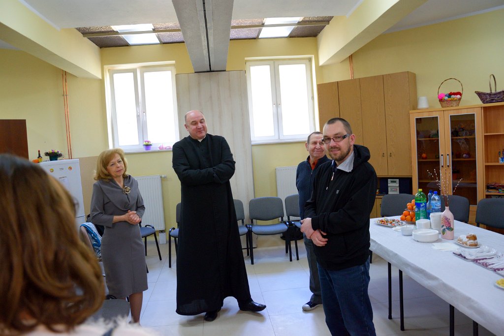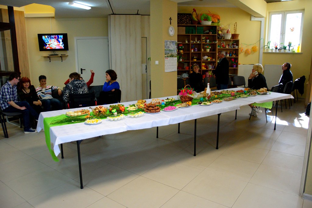 23 marca 2016 roku był w Warsztacie Terapii Zajęciowej św. Rity dniem wyjątkowym! Spotkaliśmy się w znacznie większym gronie niż zazwyczaj. Gościliśmy proboszcza parafii Matki Bożej Fatimskiej a zarazem Prezesa Legionowskiego Stowarzyszenia Amicus księdza Tomasza Chciałowskiego oraz naszych rodziców, opiekunów i rodzeństwo. O godzinie 11:00 zasiedliśmy do śniadania wielkanocnego. Uroczystość rozpoczęła kierownik Warsztatu p. Bożena Półgęsek serdecznie witając wszystkich przybyłych, następnie kilka słów na temat wspólnego dzieła, którym jest Warsztat Terapii Zajęciowej wygłosił ksiądz Tomasz Chciałowski. Ksiądz Tomasz zwrócił uwagę między innymi na fakt, iż aby takie dzieło mogło powstać i działać potrzebna jest dobra wola wielu ludzi, potrzebne jest prawdziwe zaangażowanie i szczera chęć niesienia pomocy innym. I tak właśnie już od trzech miesięcy kontynuujemy to, o czym ksiądz Tomasz pomyślał pierwszy raz niewiele ponad rok temu. To właśnie w marcu minionego roku powstała w głowie Prezesa Stowarzyszenia Amicus myśl, by uruchomić Warsztat Terapii Zajęciowej. Teraz i kadra Warsztatów i Prezes Stowarzyszenia i my, podopieczni, pracujemy by lepiej poznać świat, by lepiej przygotować się do sprawnego funkcjonowania w społeczeństwie. Po wspólnej modlitwie i poświęceniu pokarmów złożyliśmy sobie życzenia i usiedliśmy do stołów. Na zakończenie uroczystości wszyscy podopieczni Warsztatu otrzymali z rąk księdza proboszcza okolicznościowy album przybliżający nam życie i działalność św. Ojca Pio.