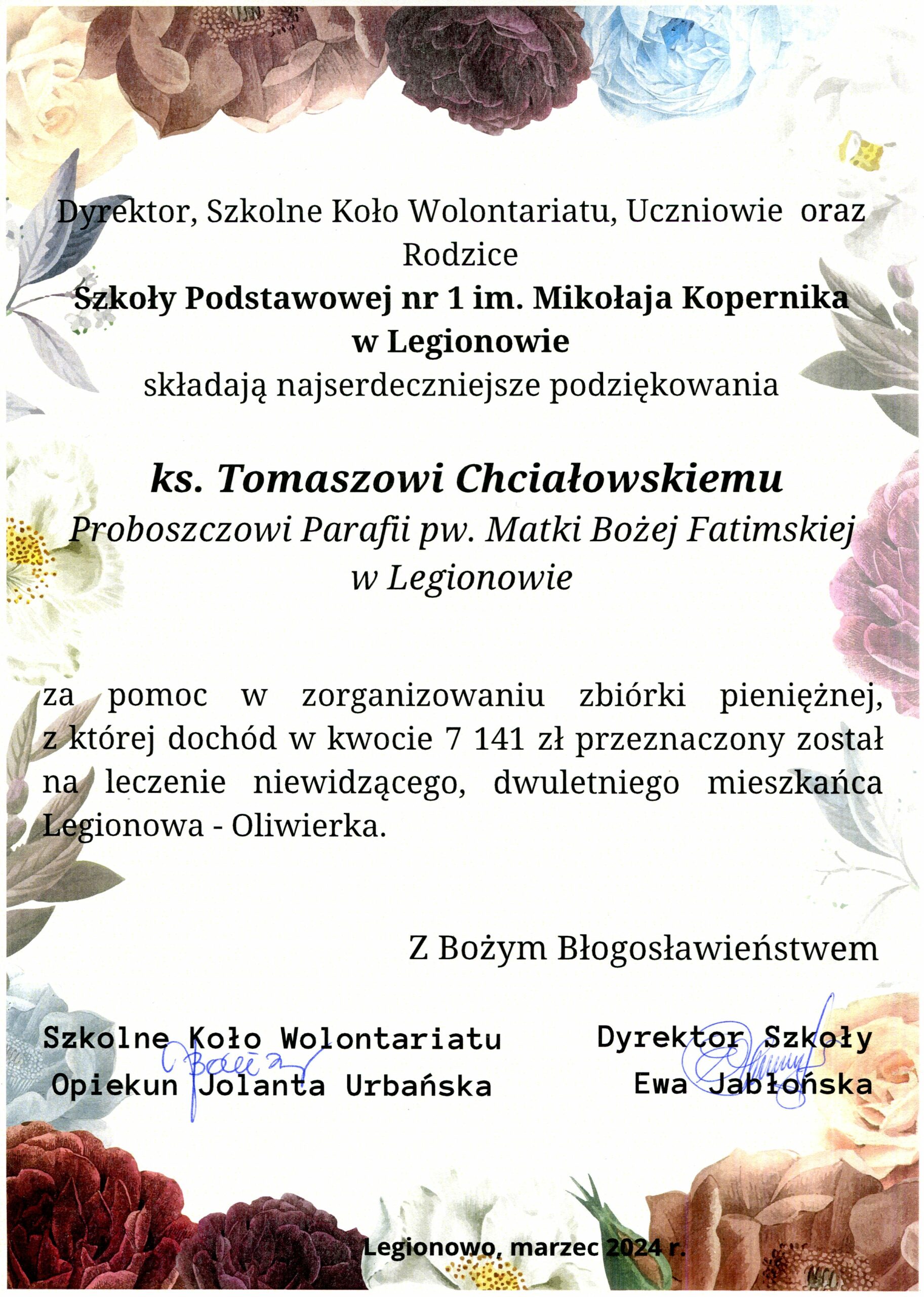 W dniu 3 marca 2024 roku w Parafii Matki Bożej Fatimskiej w Legionowie odbyła się zbiórka na leczenie niewidzącego, dwuletniego mieszkańca Legionowa – Oliwierka. Z całego serca pragniemy podziękować wszystkim Parafianom i Darczyńcom za okazane wsparcie i wrażliwość. Dołączamy również najserdeczniejsze podziękowania dla Księdza Proboszcza Tomasza Chciałowskiego za pomoc w zorganizowaniu zbiórki pieniężnej. Podczas zbiórki udało nam się zebrać kwotę 7,141 zł. Serdeczne podziękowania przekazują organizatorzy zbiórki: Dyrektor Szkoły, Szkolne Koło Wolontariatu, Uczniowie oraz Rodzice Szkoły Podstawowej nr 1 im. Mikołaja Kopernika.