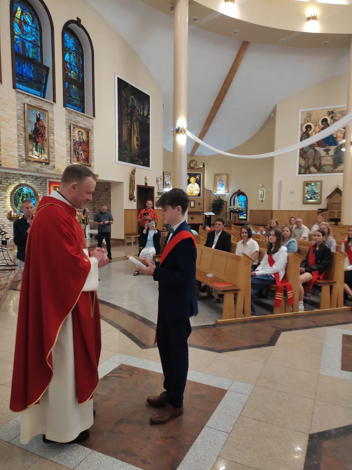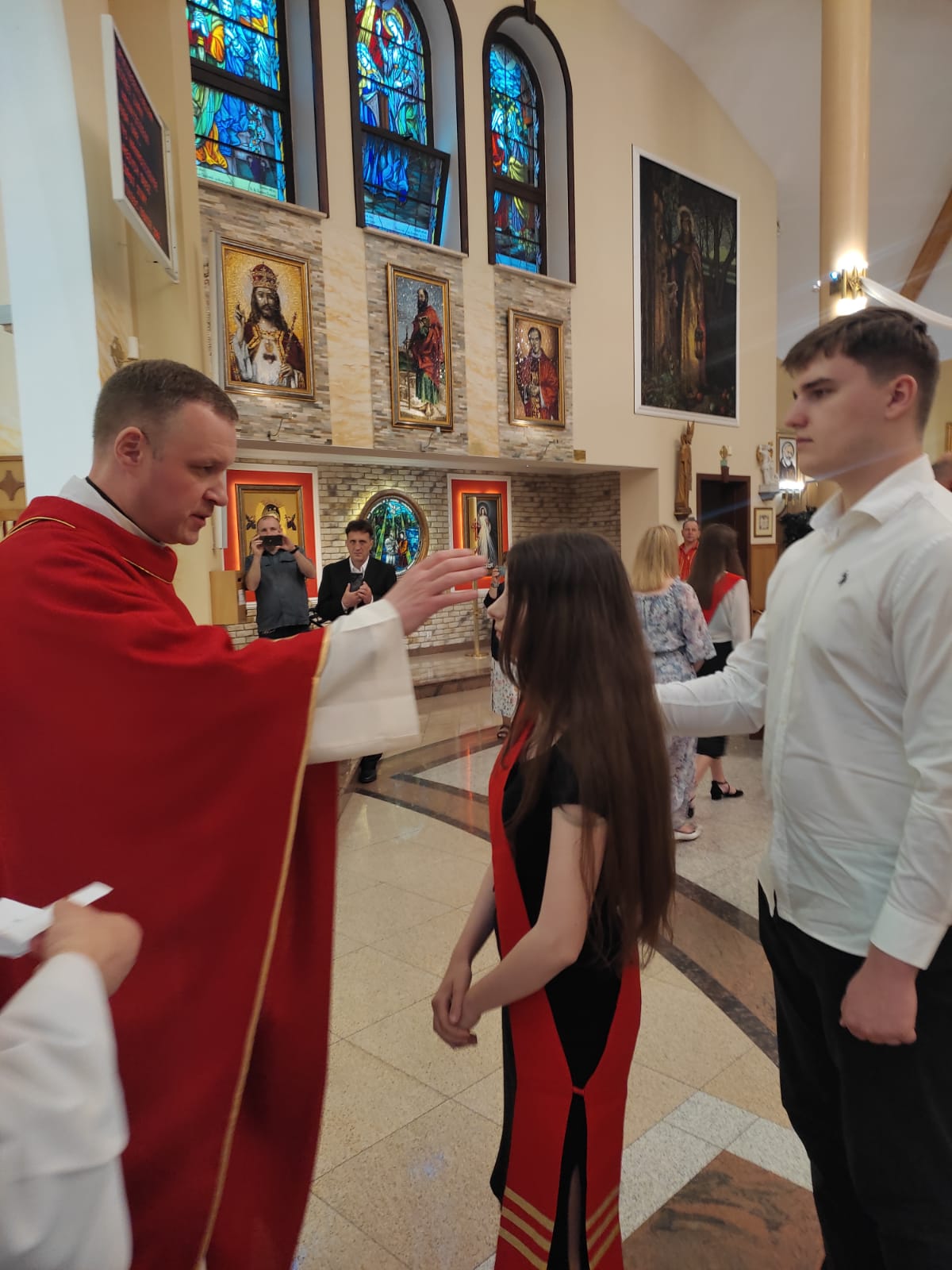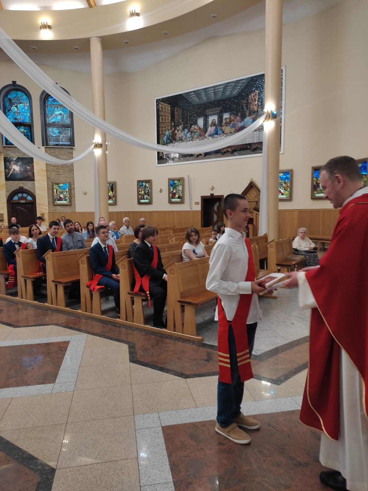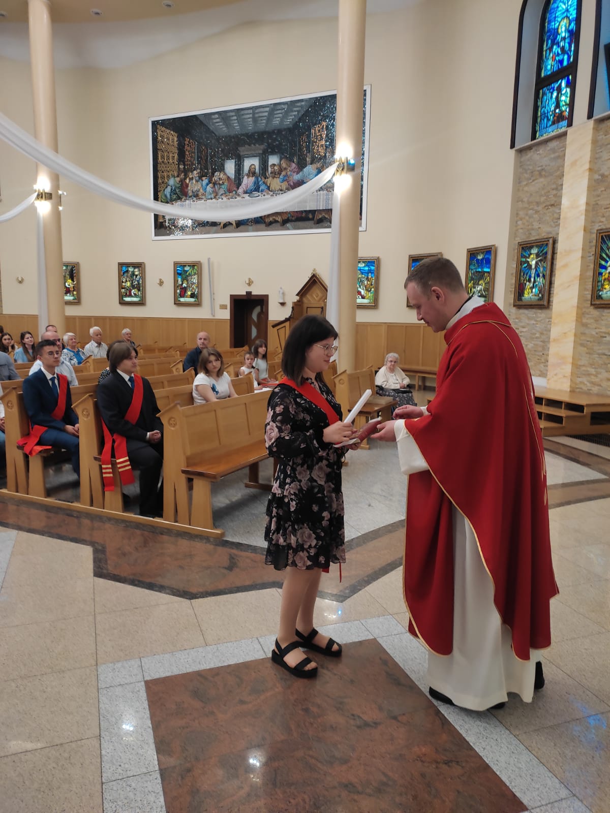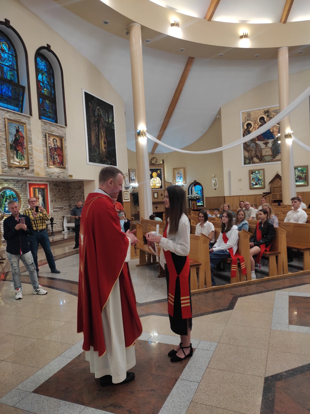 Wtorek 18 czerwca był dniem udzielenia 14 osobom sakramentu dojrzałości chrześcijańskiej. Na Mszy św. o godz. 19:00 nasi kandydaci wraz ze świadkami i zaproszonymi gośćmi uczestniczyli w Eucharystii sprawowanej przez ks. prałata Macieja Miętka – kanclerza naszej kurii, który z ramienia Księdza Biskupa udzielił sakramentu bierzmowania. W homilii ks. kanclerz nawiązał do słów św. Ireneusza, który podkreślił, że nie ma większej wartości, większego skarbu nad Ewangelią Jezusa Chrystusa w której wszystko zostało zawarte, całe szczęście. Na koniec uroczystości wybierzmowane osoby uroczyście miały wręczone egzemplarze Pisma świętego i pamiątkowe dyplomy, oraz świece sakramentu bierzmowania.