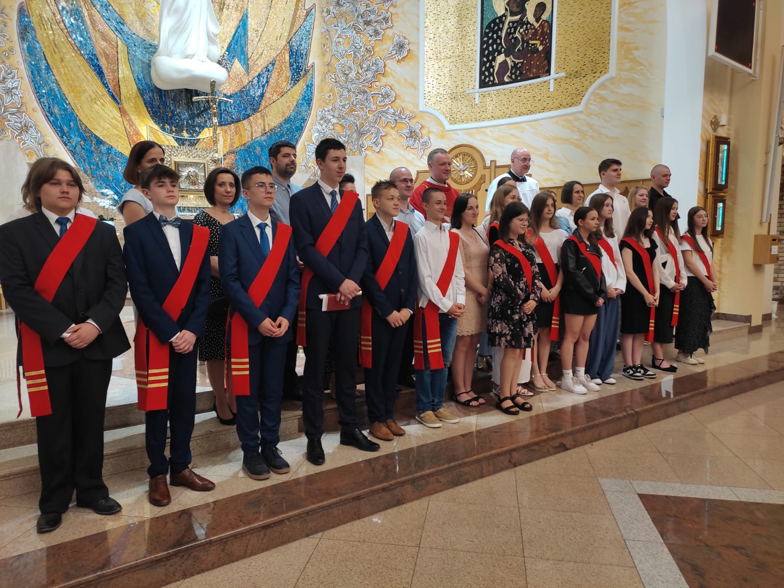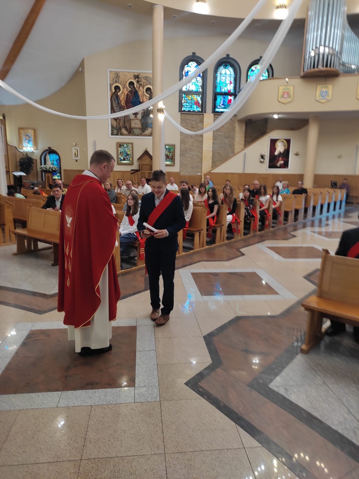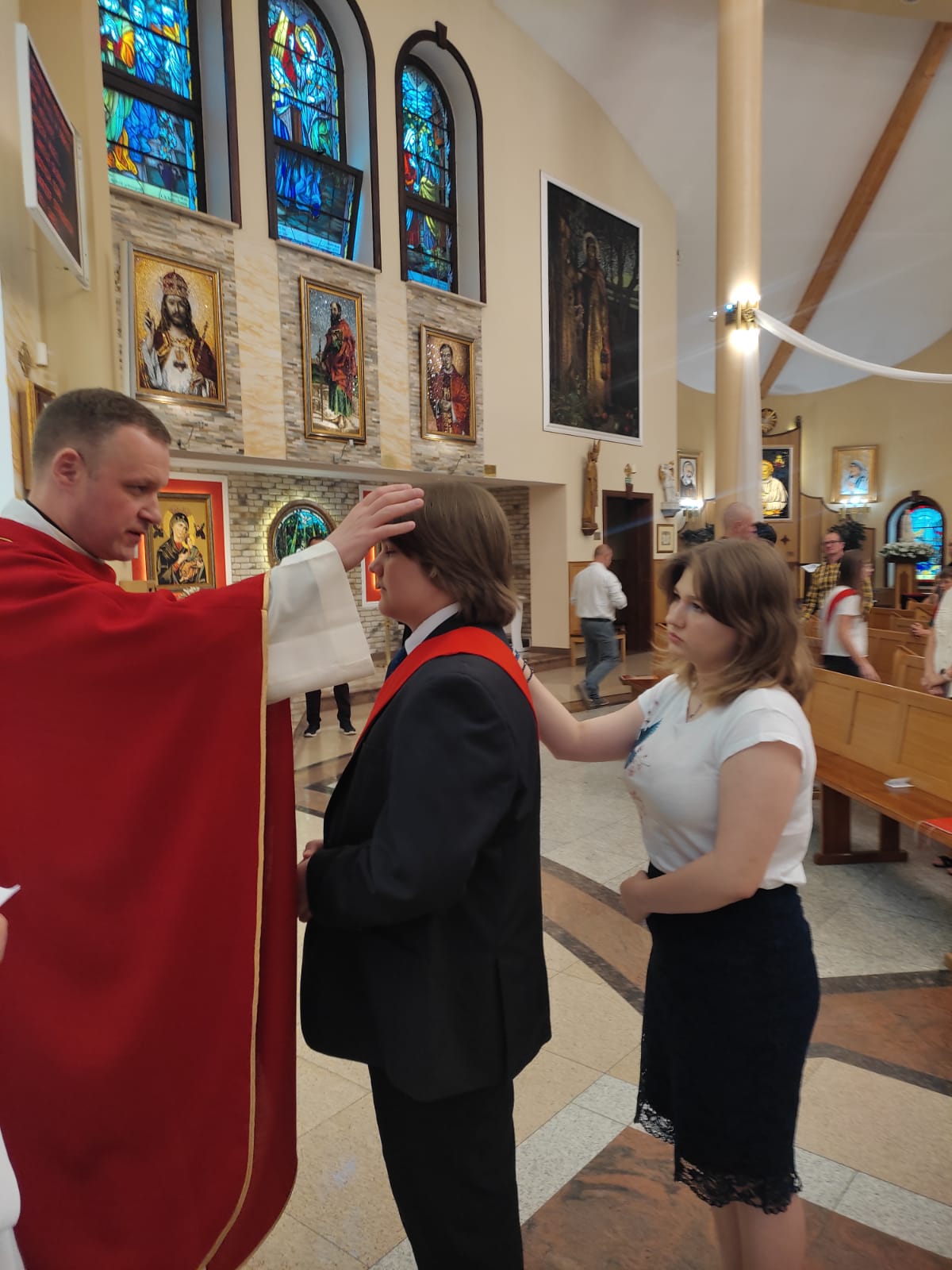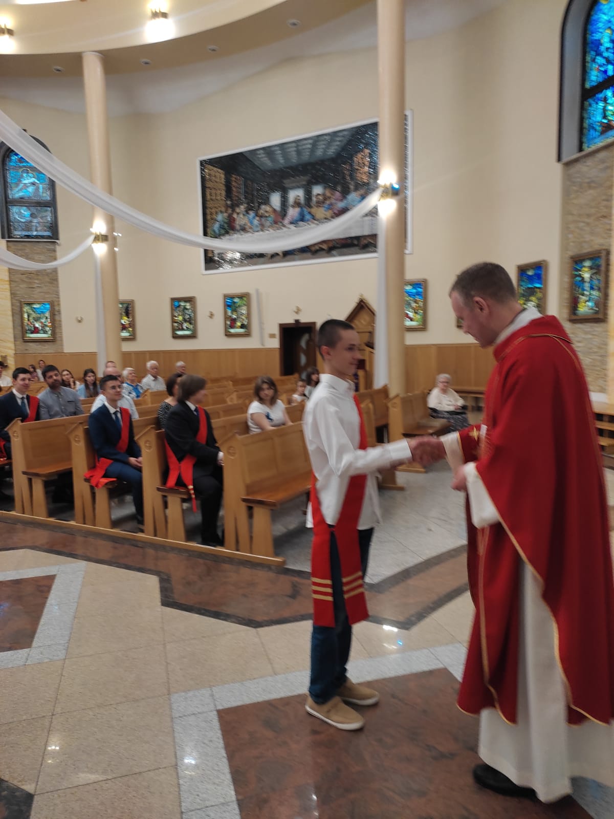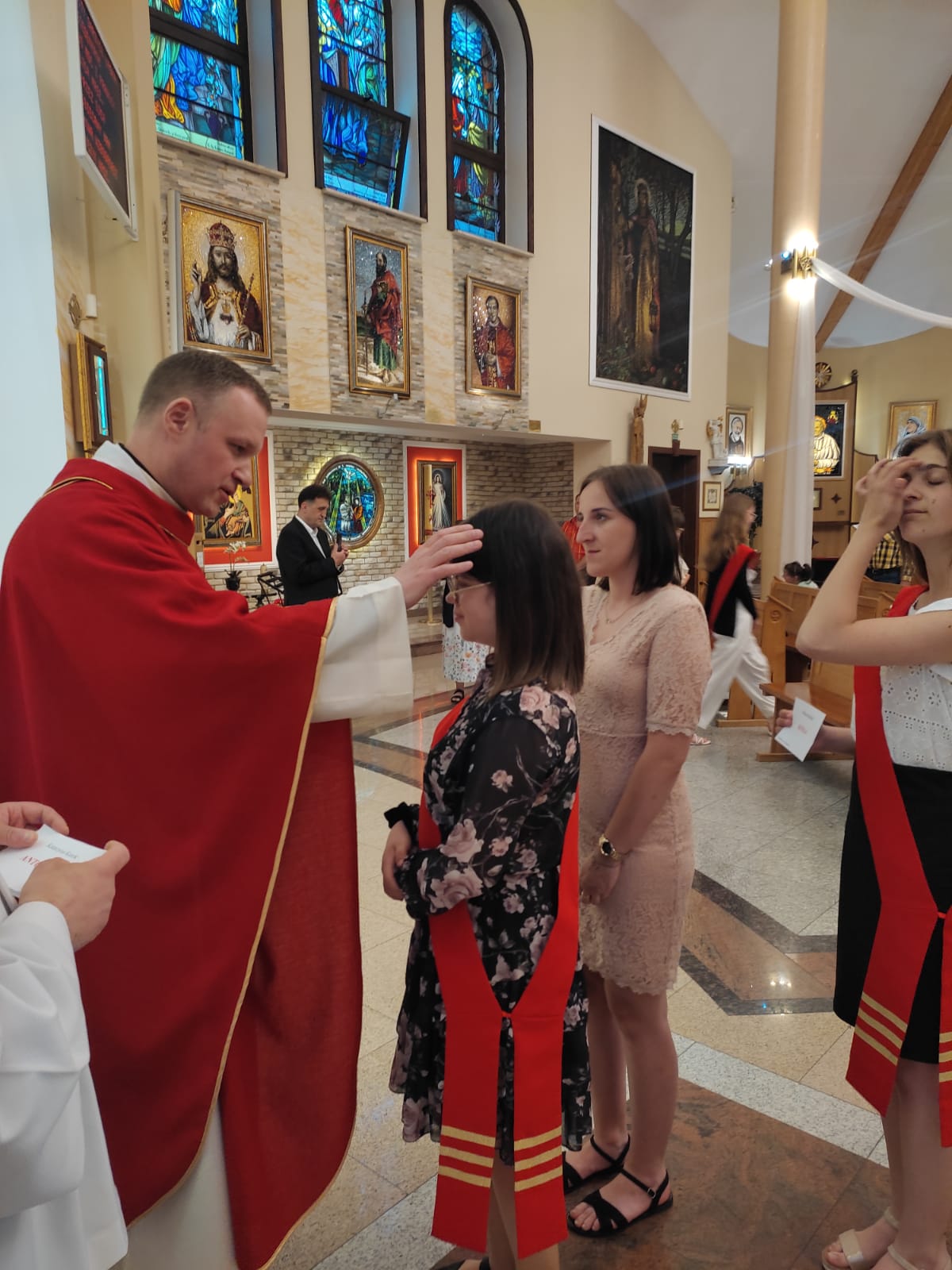 Wtorek 18 czerwca był dniem udzielenia 14 osobom sakramentu dojrzałości chrześcijańskiej. Na Mszy św. o godz. 19:00 nasi kandydaci wraz ze świadkami i zaproszonymi gośćmi uczestniczyli w Eucharystii sprawowanej przez ks. prałata Macieja Miętka – kanclerza naszej kurii, który z ramienia Księdza Biskupa udzielił sakramentu bierzmowania. W homilii ks. kanclerz nawiązał do słów św. Ireneusza, który podkreślił, że nie ma większej wartości, większego skarbu nad Ewangelią Jezusa Chrystusa w której wszystko zostało zawarte, całe szczęście. Na koniec uroczystości wybierzmowane osoby uroczyście miały wręczone egzemplarze Pisma świętego i pamiątkowe dyplomy, oraz świece sakramentu bierzmowania.