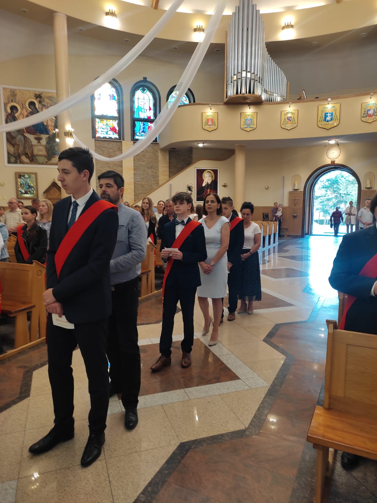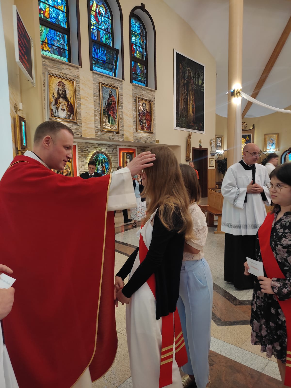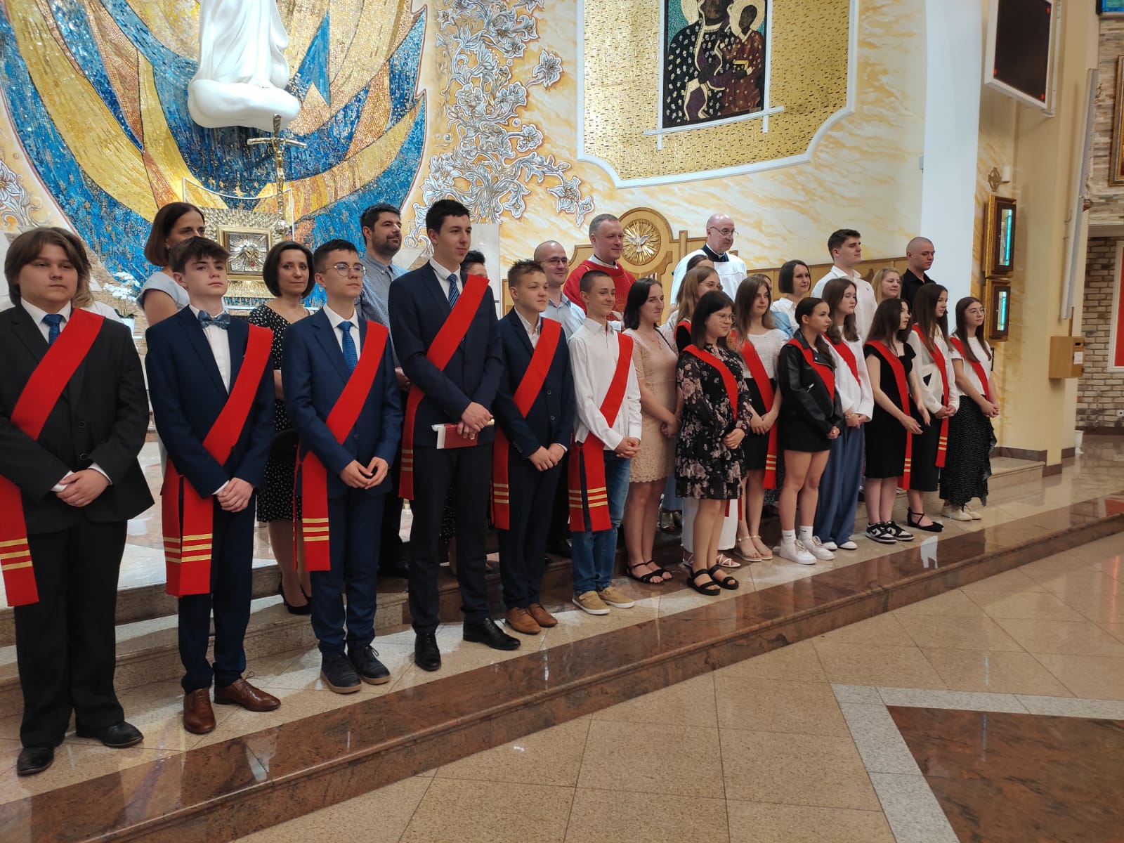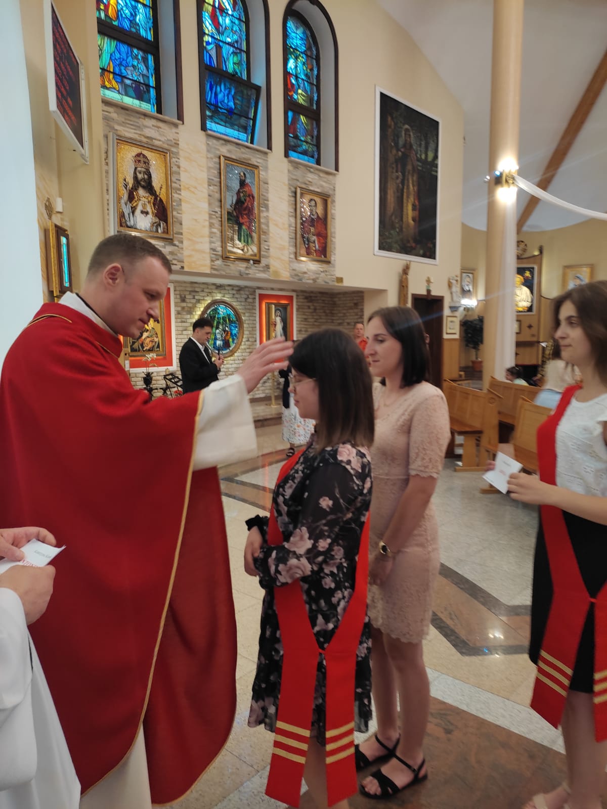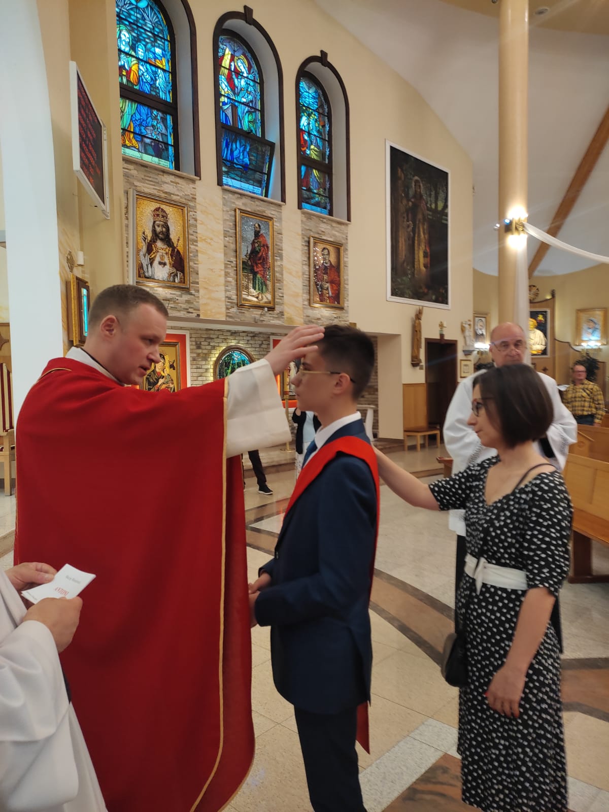 Wtorek 18 czerwca był dniem udzielenia 14 osobom sakramentu dojrzałości chrześcijańskiej. Na Mszy św. o godz. 19:00 nasi kandydaci wraz ze świadkami i zaproszonymi gośćmi uczestniczyli w Eucharystii sprawowanej przez ks. prałata Macieja Miętka – kanclerza naszej kurii, który z ramienia Księdza Biskupa udzielił sakramentu bierzmowania. W homilii ks. kanclerz nawiązał do słów św. Ireneusza, który podkreślił, że nie ma większej wartości, większego skarbu nad Ewangelią Jezusa Chrystusa w której wszystko zostało zawarte, całe szczęście. Na koniec uroczystości wybierzmowane osoby uroczyście miały wręczone egzemplarze Pisma świętego i pamiątkowe dyplomy, oraz świece sakramentu bierzmowania.