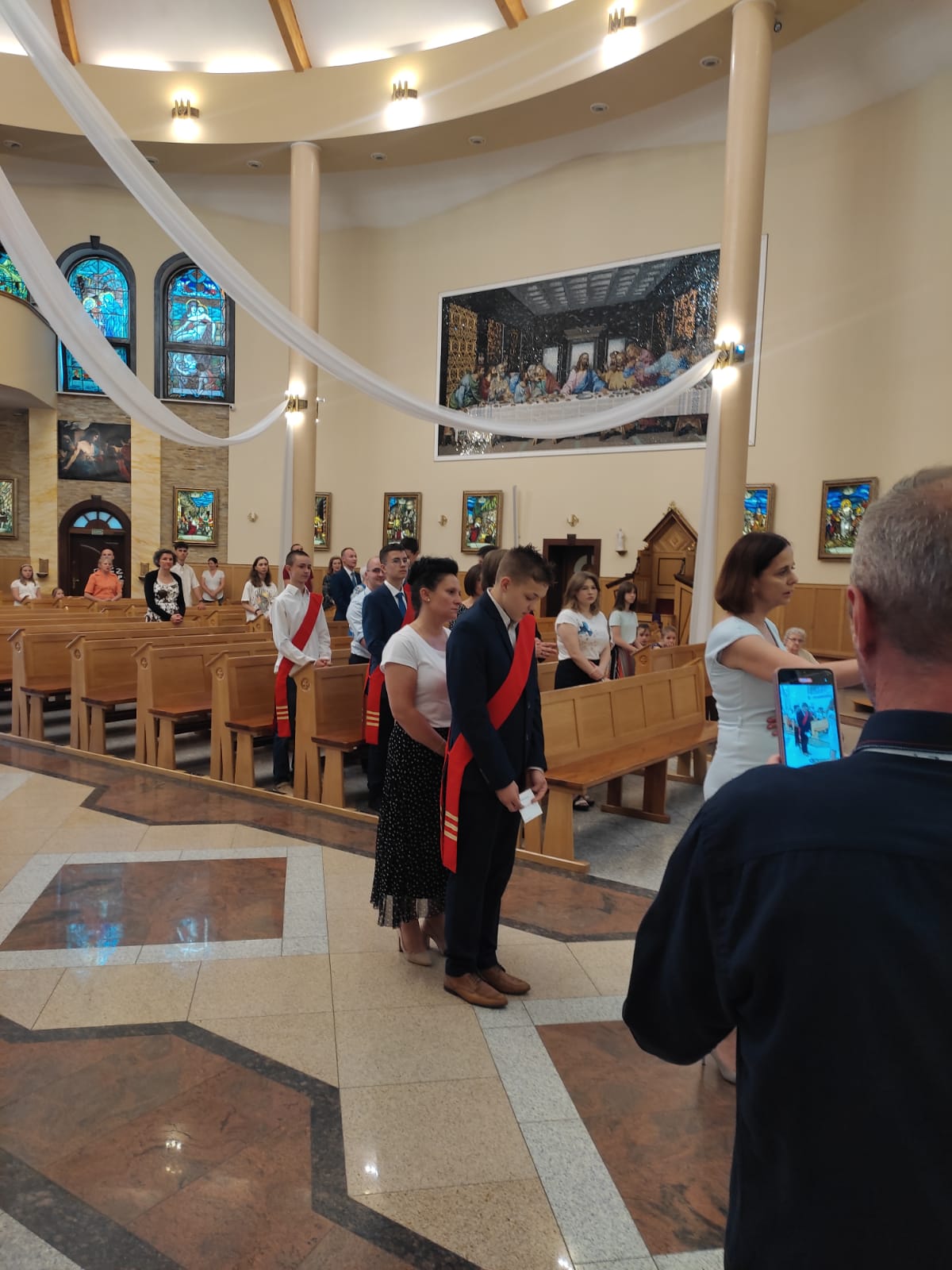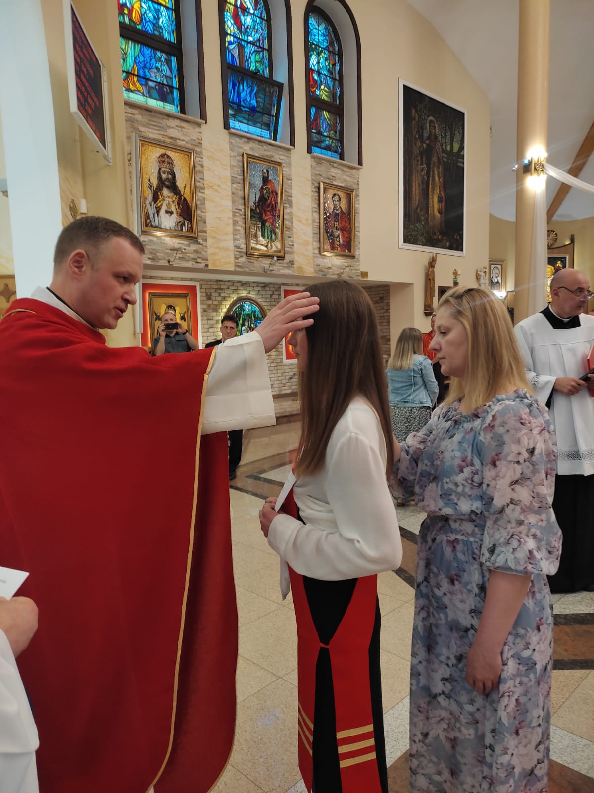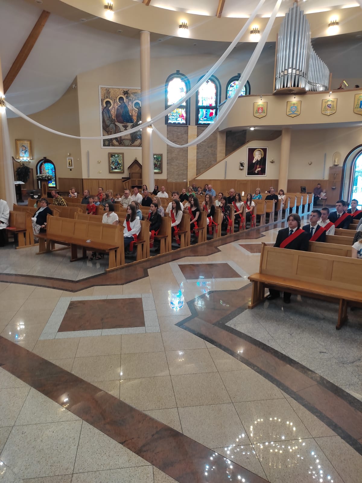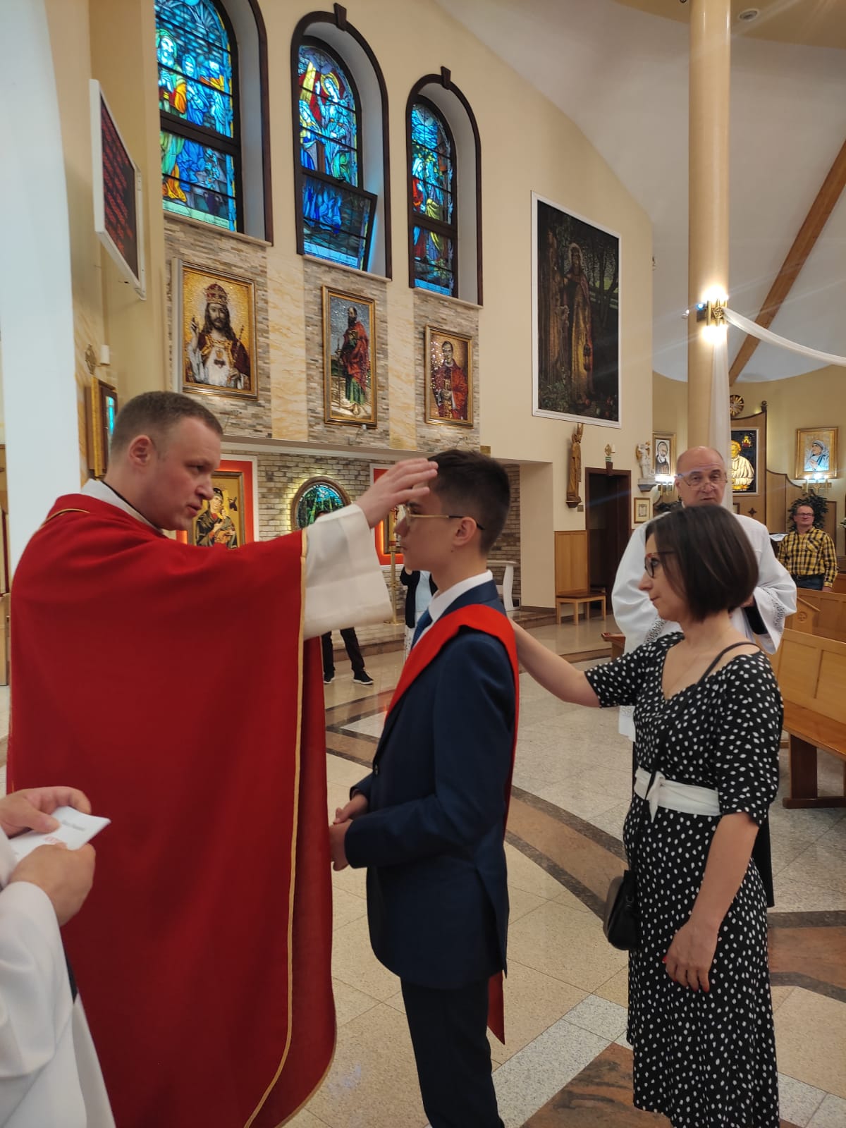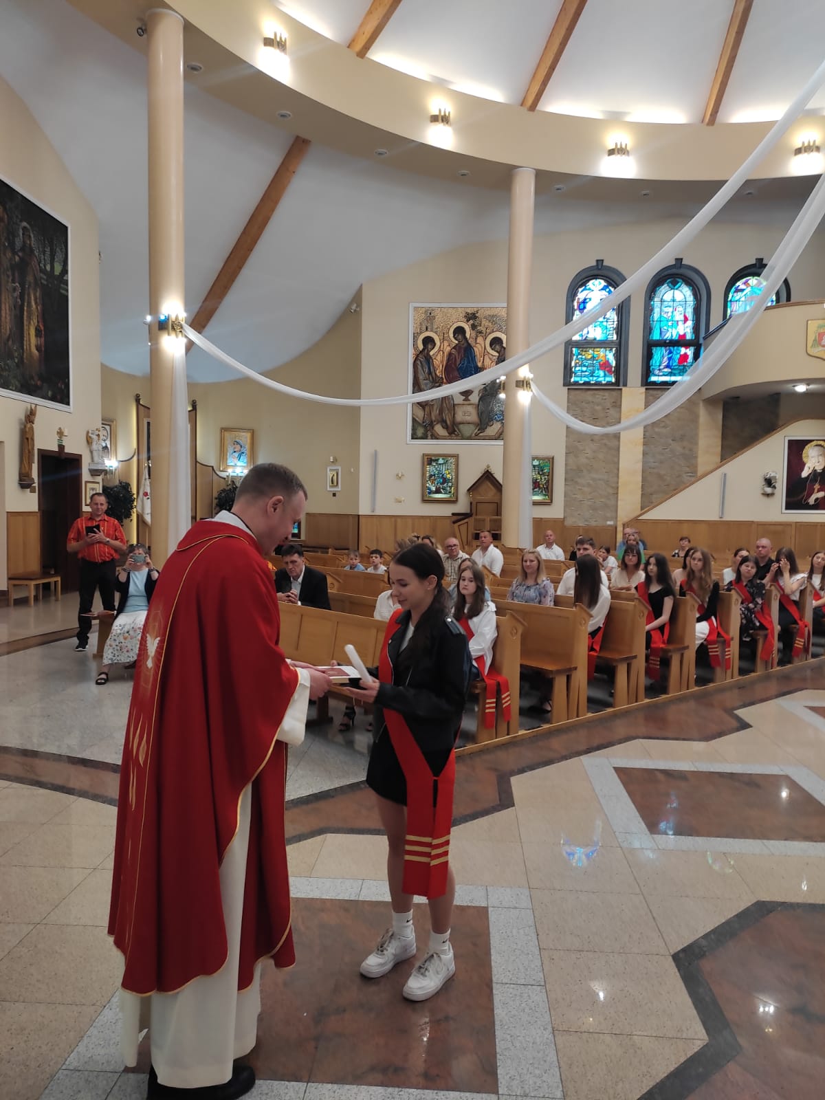 Wtorek 18 czerwca był dniem udzielenia 14 osobom sakramentu dojrzałości chrześcijańskiej. Na Mszy św. o godz. 19:00 nasi kandydaci wraz ze świadkami i zaproszonymi gośćmi uczestniczyli w Eucharystii sprawowanej przez ks. prałata Macieja Miętka – kanclerza naszej kurii, który z ramienia Księdza Biskupa udzielił sakramentu bierzmowania. W homilii ks. kanclerz nawiązał do słów św. Ireneusza, który podkreślił, że nie ma większej wartości, większego skarbu nad Ewangelią Jezusa Chrystusa w której wszystko zostało zawarte, całe szczęście. Na koniec uroczystości wybierzmowane osoby uroczyście miały wręczone egzemplarze Pisma świętego i pamiątkowe dyplomy, oraz świece sakramentu bierzmowania.