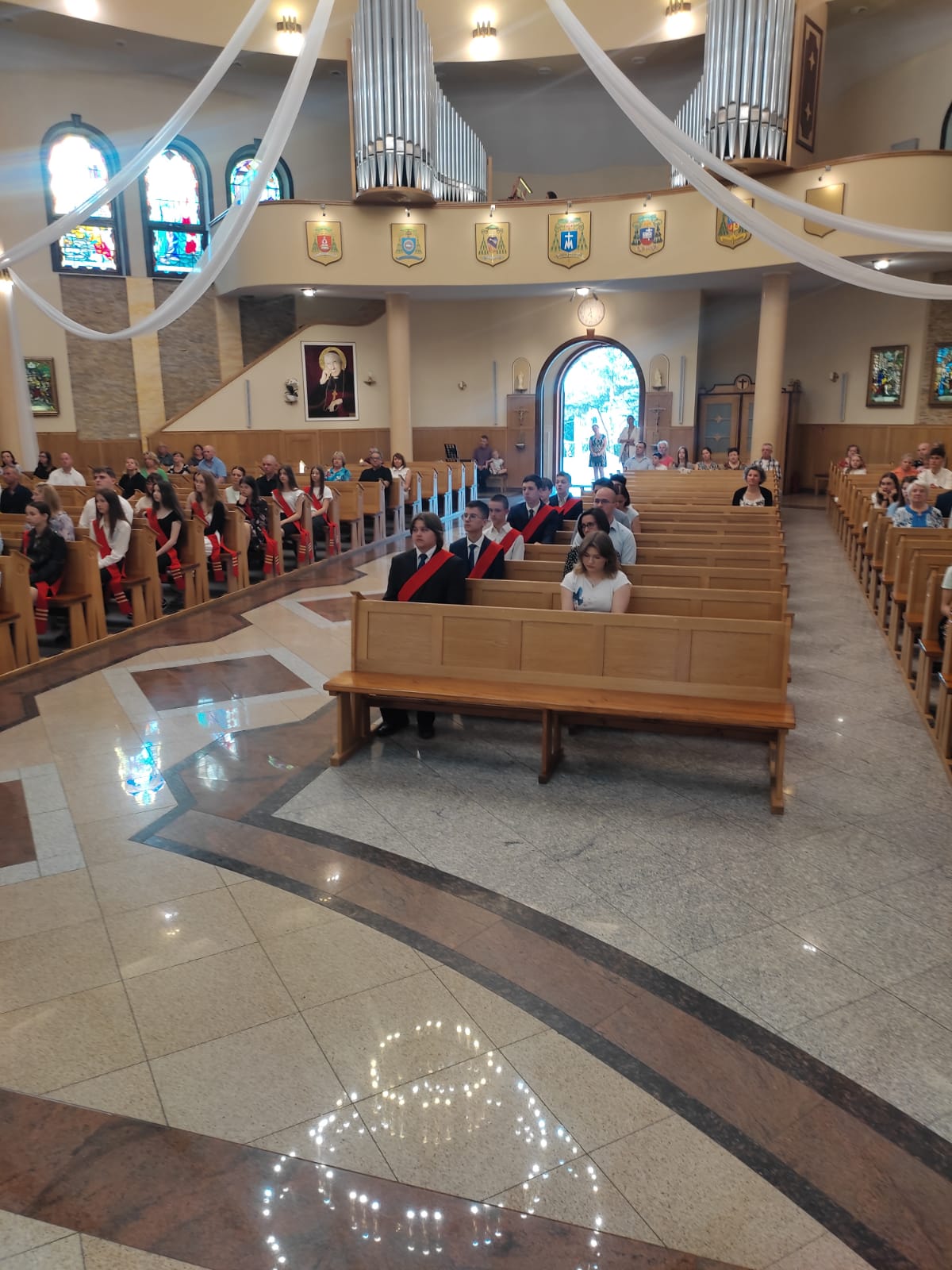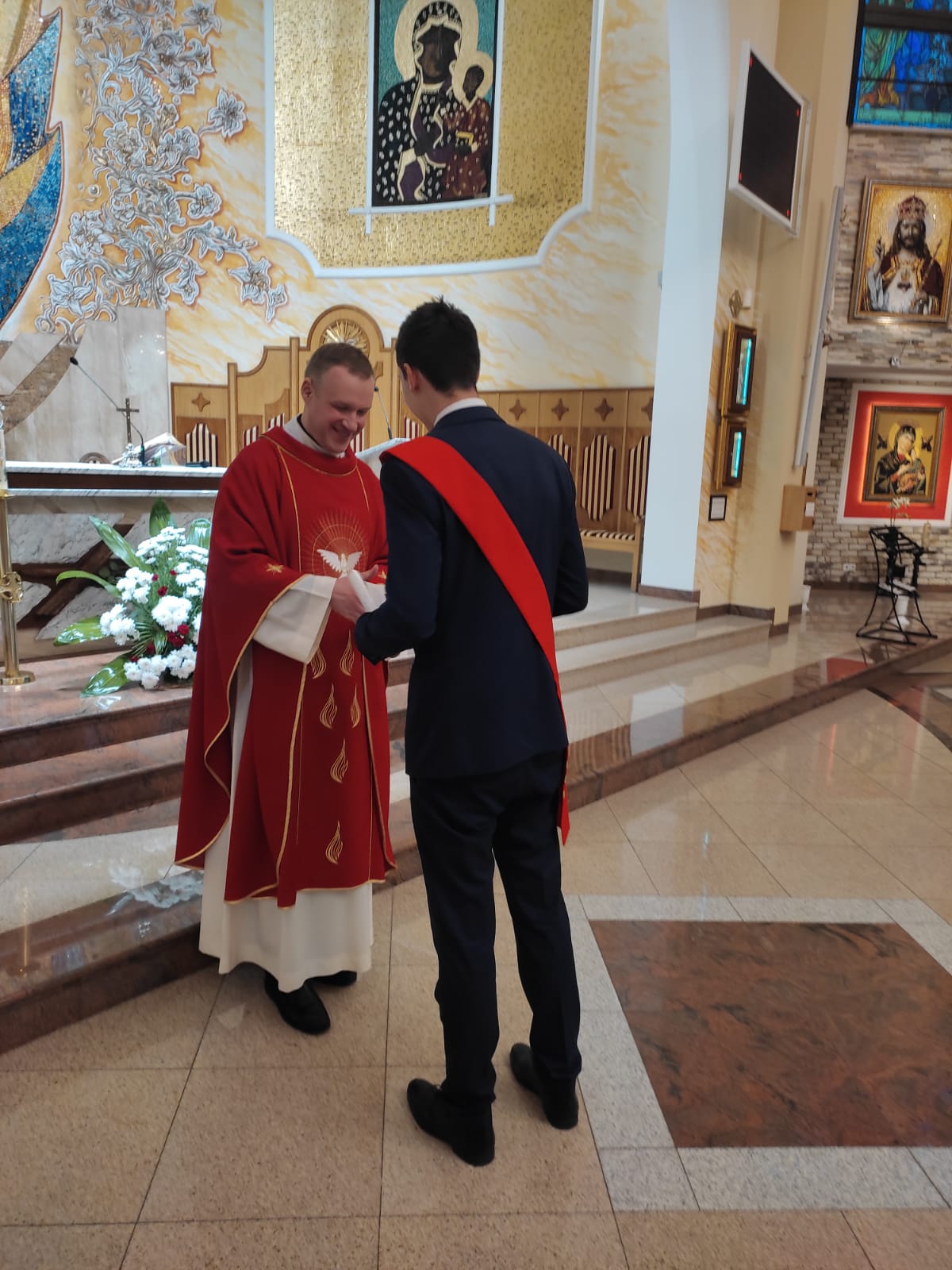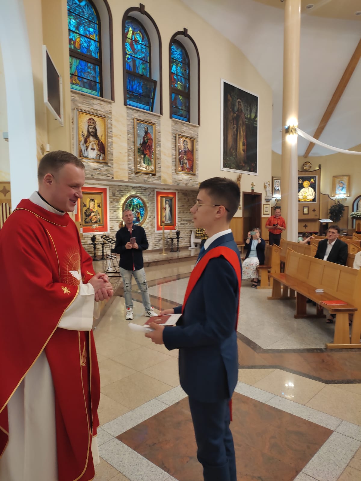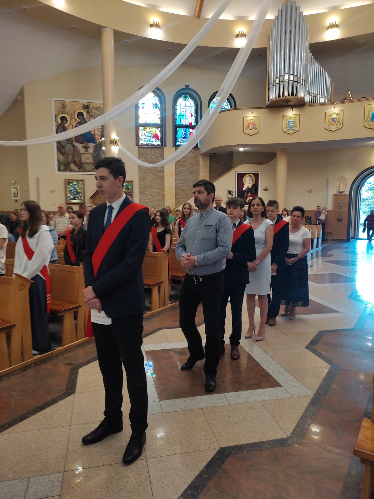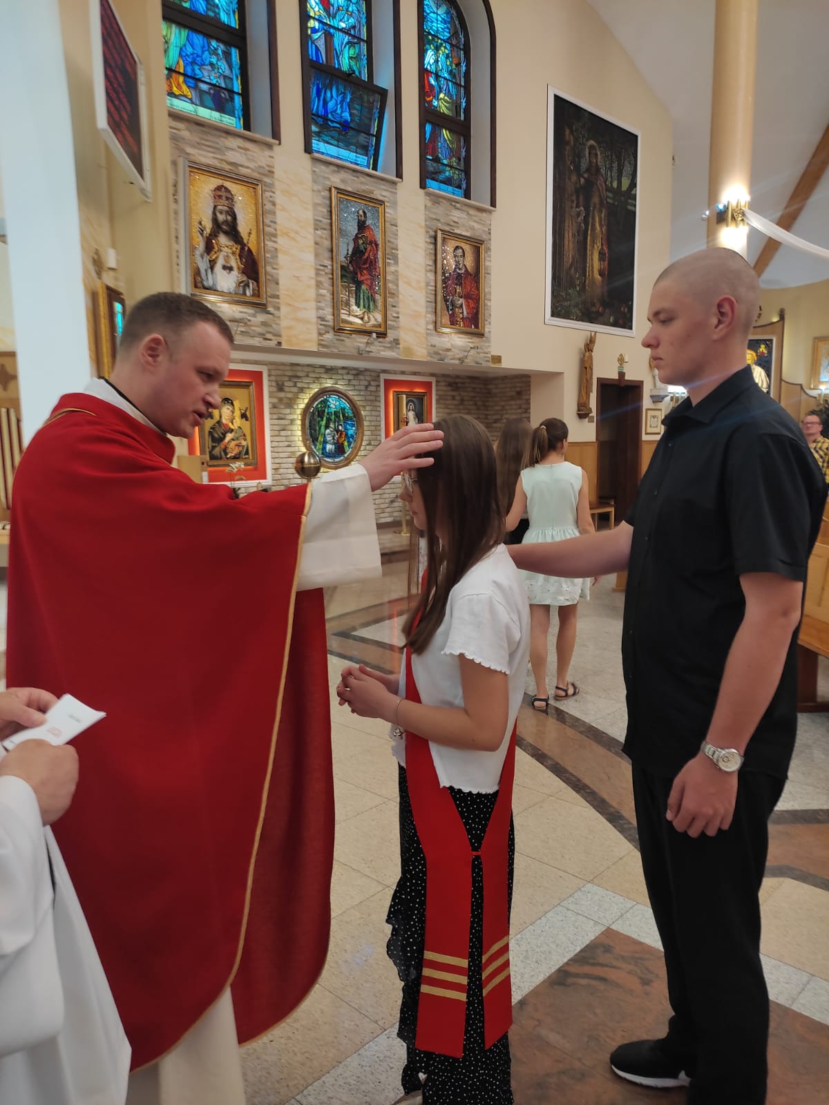 Wtorek 18 czerwca był dniem udzielenia 14 osobom sakramentu dojrzałości chrześcijańskiej. Na Mszy św. o godz. 19:00 nasi kandydaci wraz ze świadkami i zaproszonymi gośćmi uczestniczyli w Eucharystii sprawowanej przez ks. prałata Macieja Miętka – kanclerza naszej kurii, który z ramienia Księdza Biskupa udzielił sakramentu bierzmowania. W homilii ks. kanclerz nawiązał do słów św. Ireneusza, który podkreślił, że nie ma większej wartości, większego skarbu nad Ewangelią Jezusa Chrystusa w której wszystko zostało zawarte, całe szczęście. Na koniec uroczystości wybierzmowane osoby uroczyście miały wręczone egzemplarze Pisma świętego i pamiątkowe dyplomy, oraz świece sakramentu bierzmowania.