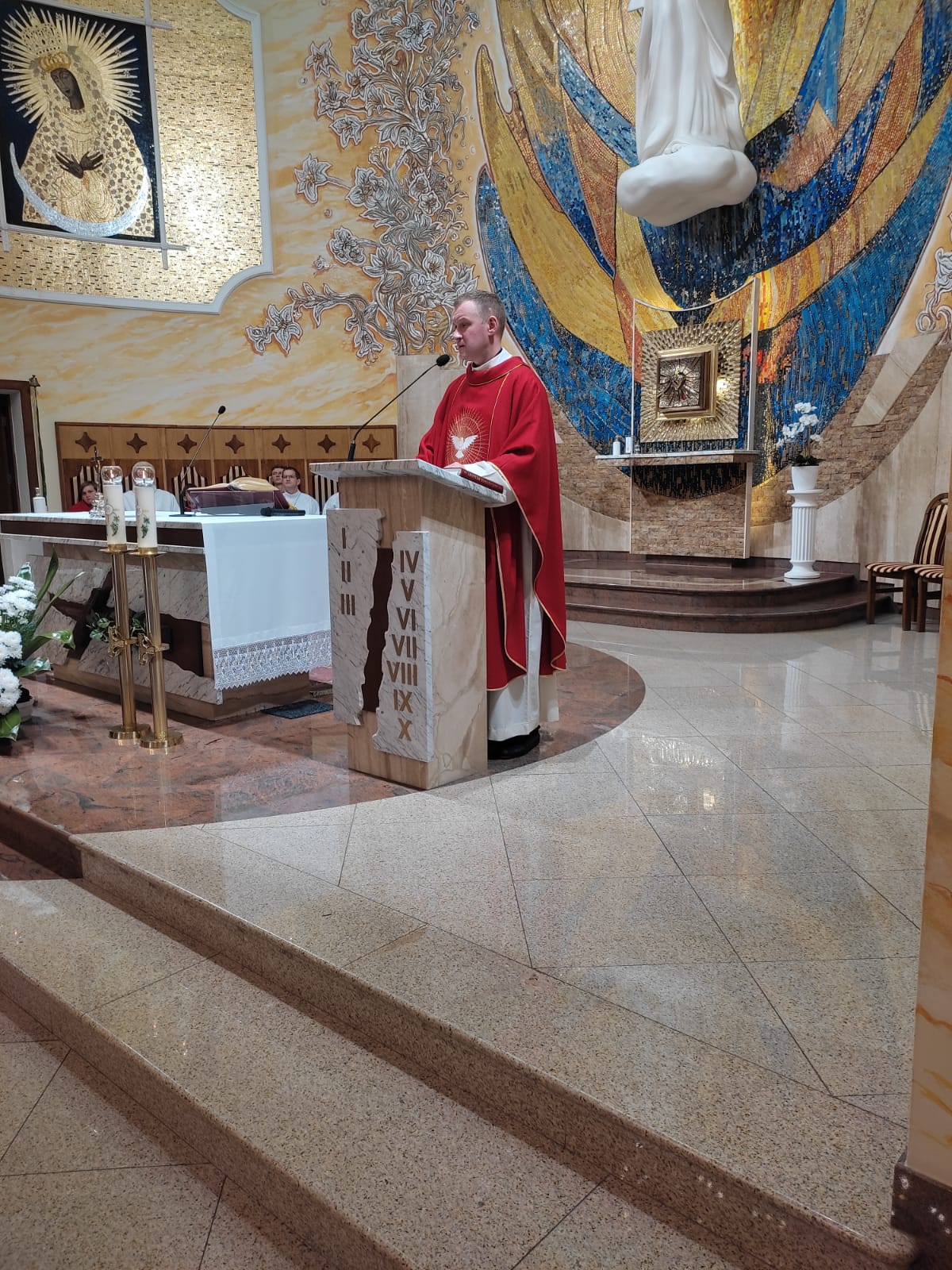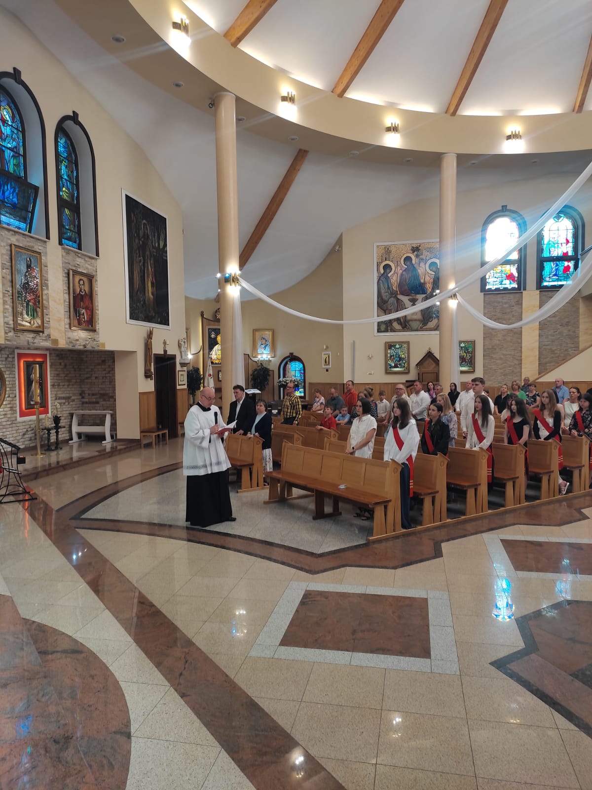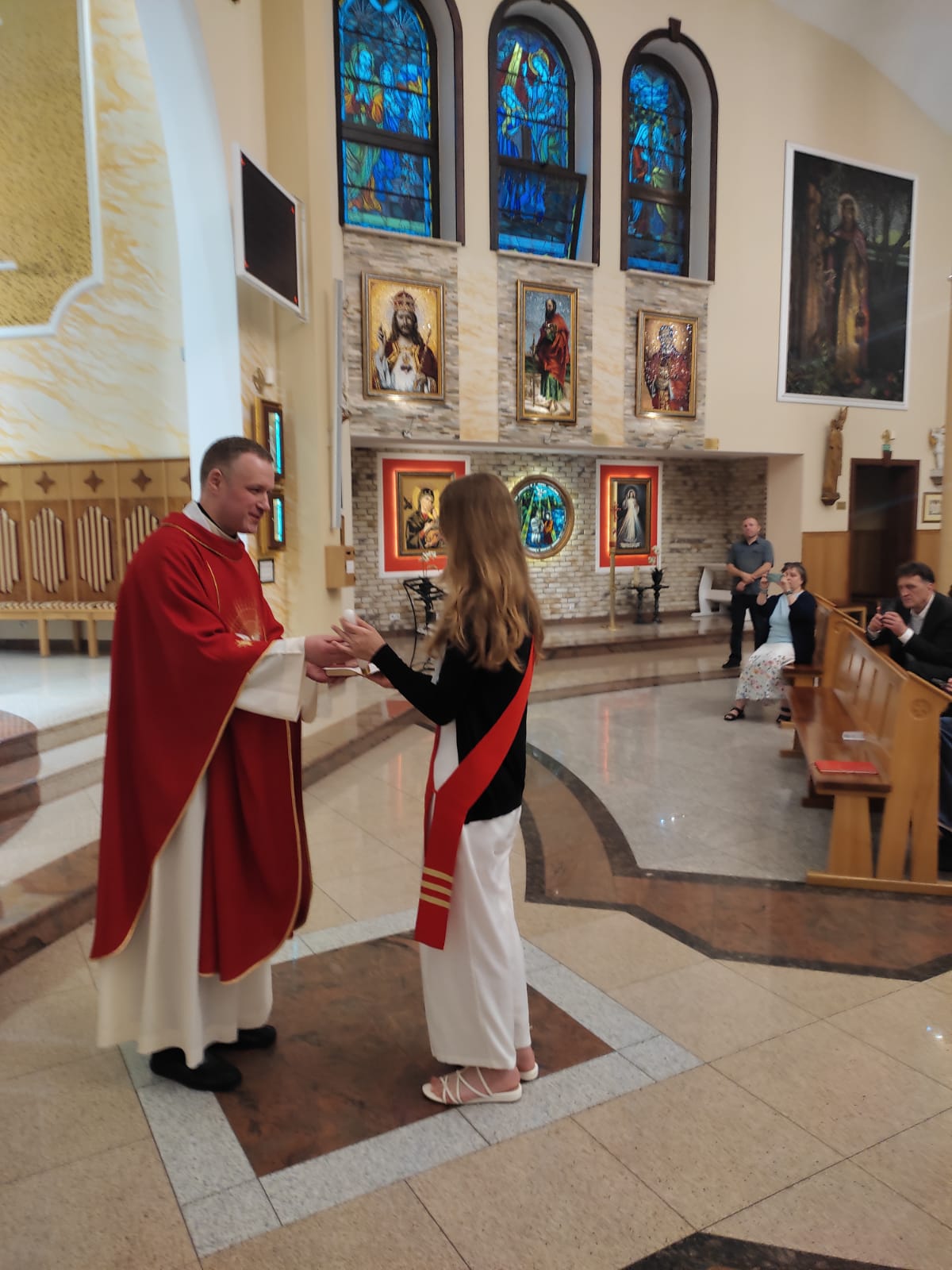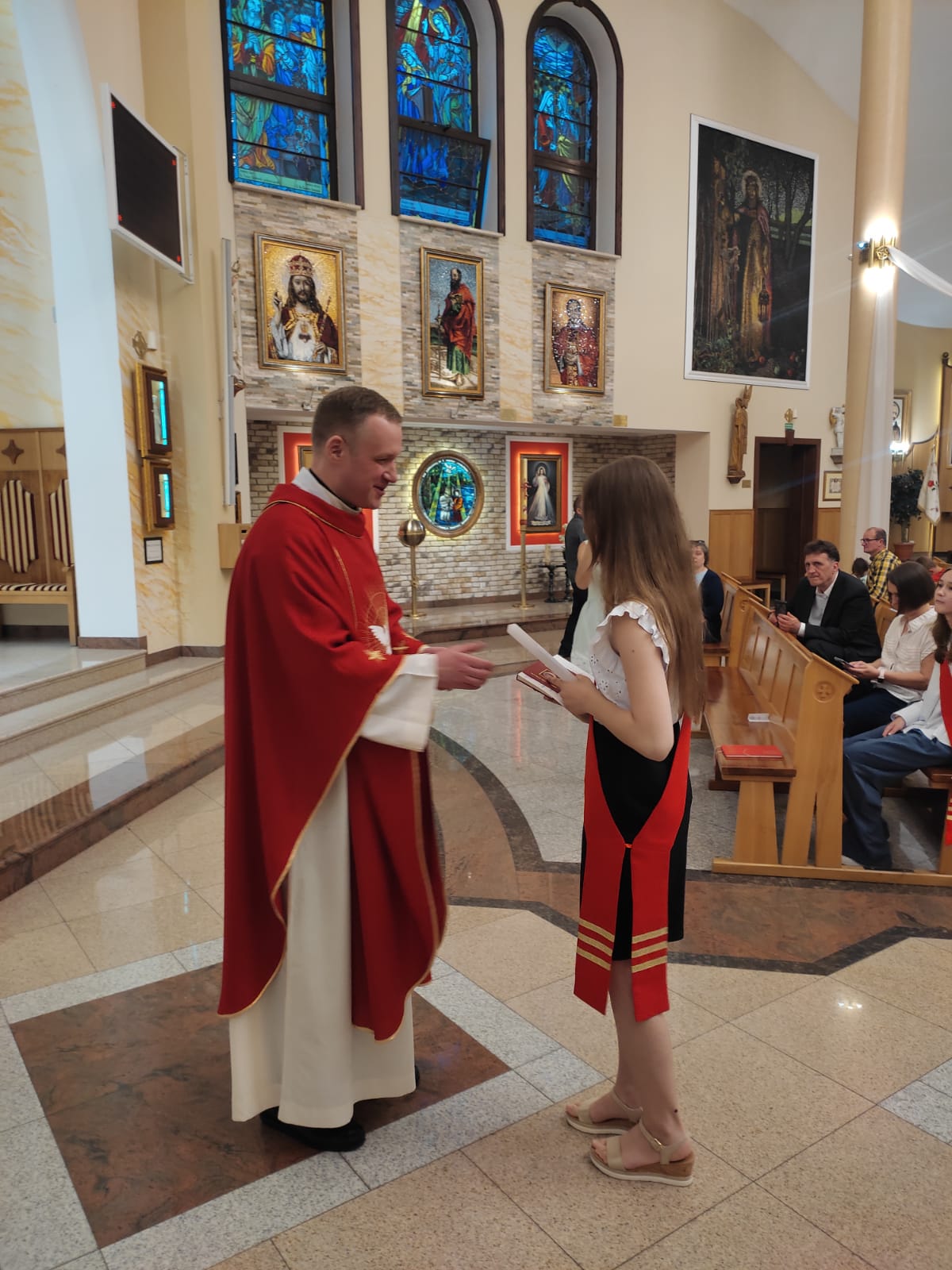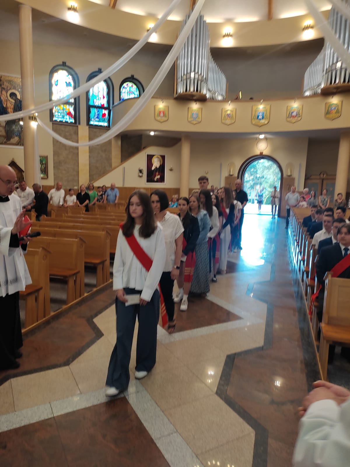 Wtorek 18 czerwca był dniem udzielenia 14 osobom sakramentu dojrzałości chrześcijańskiej. Na Mszy św. o godz. 19:00 nasi kandydaci wraz ze świadkami i zaproszonymi gośćmi uczestniczyli w Eucharystii sprawowanej przez ks. prałata Macieja Miętka – kanclerza naszej kurii, który z ramienia Księdza Biskupa udzielił sakramentu bierzmowania. W homilii ks. kanclerz nawiązał do słów św. Ireneusza, który podkreślił, że nie ma większej wartości, większego skarbu nad Ewangelią Jezusa Chrystusa w której wszystko zostało zawarte, całe szczęście. Na koniec uroczystości wybierzmowane osoby uroczyście miały wręczone egzemplarze Pisma świętego i pamiątkowe dyplomy, oraz świece sakramentu bierzmowania.