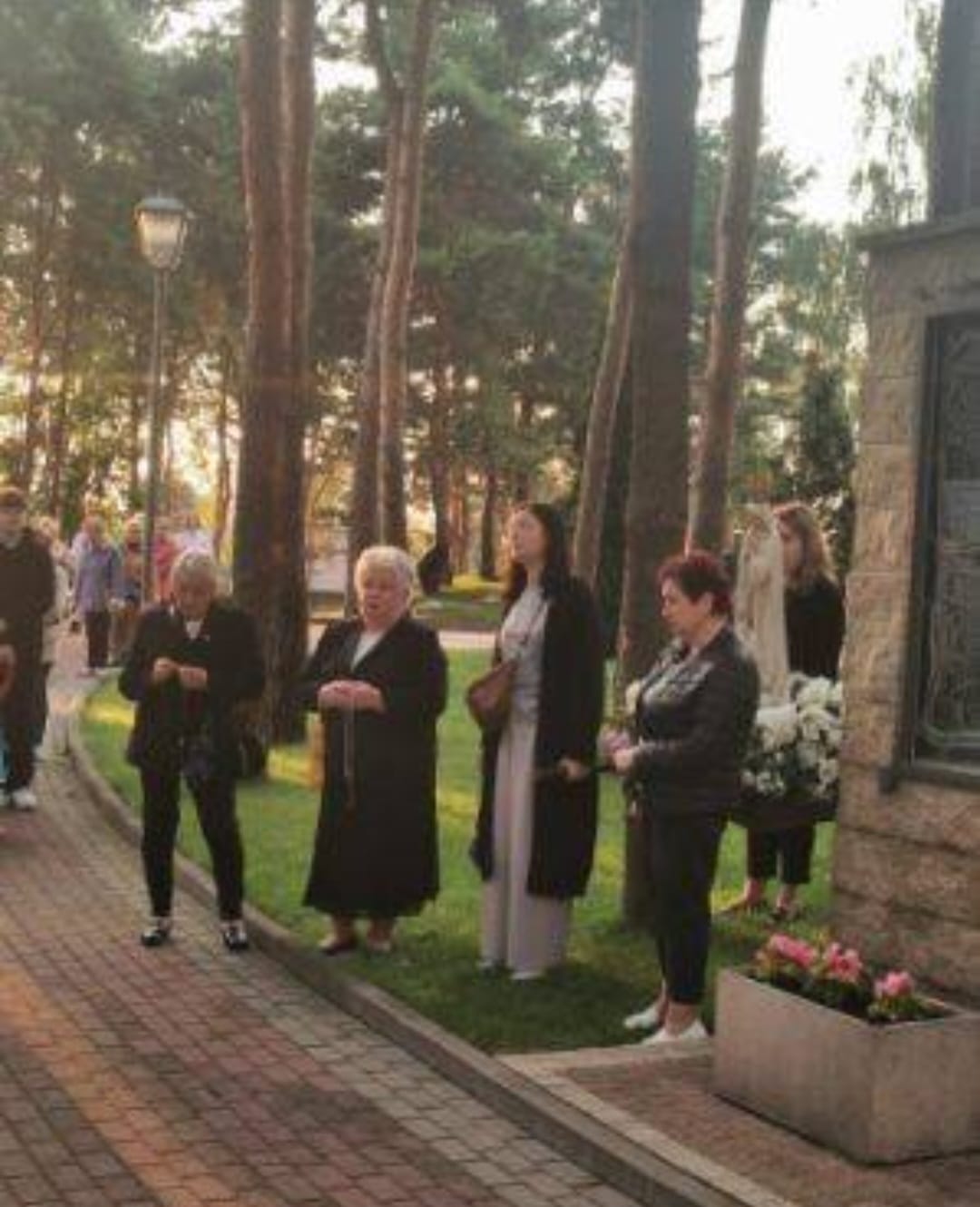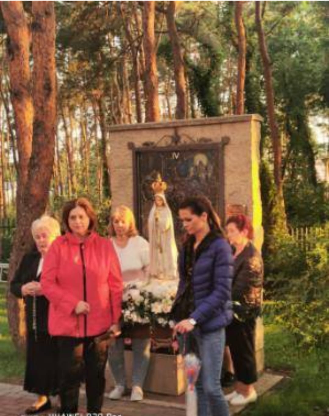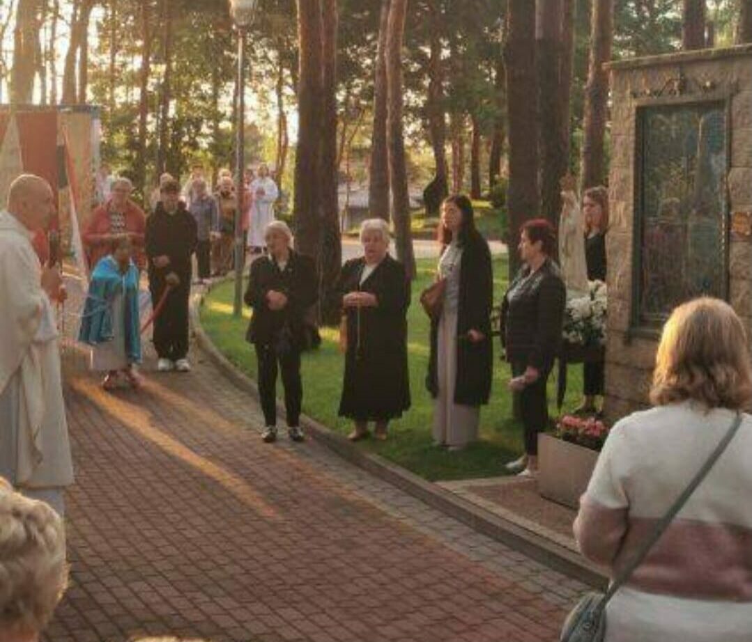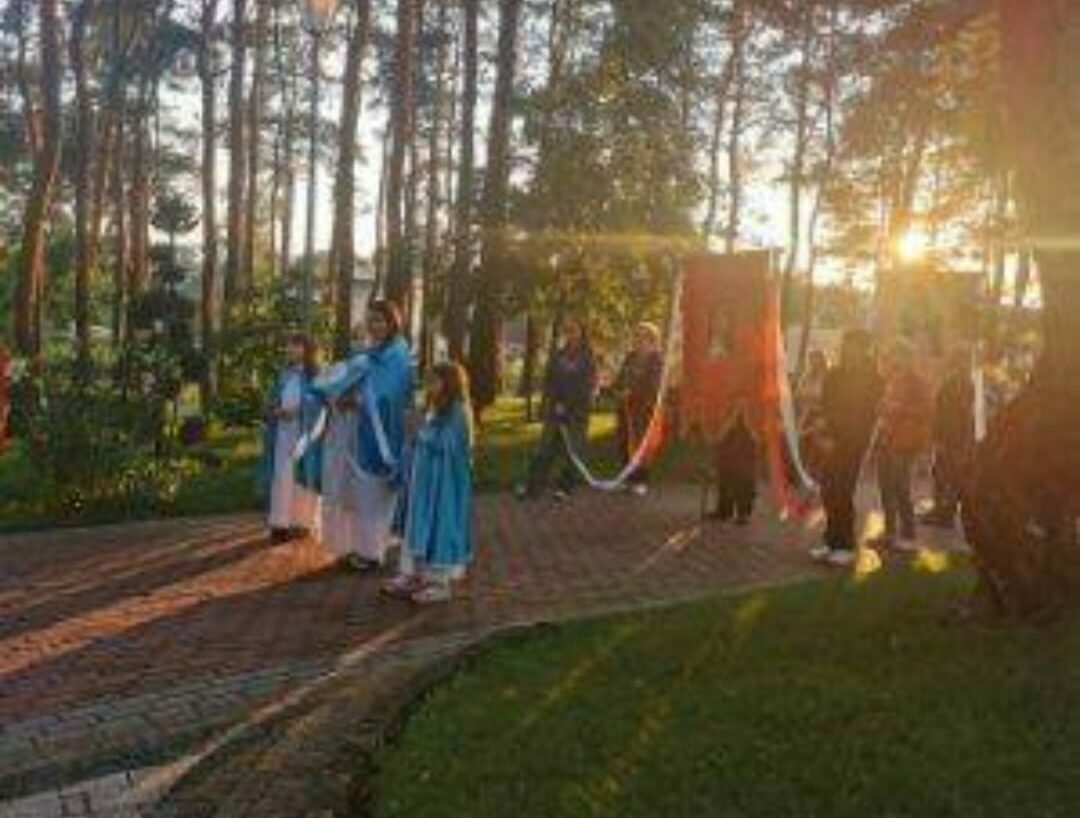 Po Mszy św. wyruszyliśmy procesyjnie w procesję fatimską. Zatrzymywaliśmy się przy każdym ołtarzu różańcowym, aby wsłuchać się w rozważanie tajemnicy różańcowej i by polecić Matce Bożej intencje, które były złożone przed ołtarzem przed Mszą św. i oczywiście by modlić się modlitwą różańcową. Przy ostatnim ołtarzu modliliśmy się za wszystkie grupy parafialne działające w parafii i dzieła Legionowskiego Stowarzyszenia AMICUS. Nasze nabożeństwo zakończyliśmy odśpiewaniem Apelu Jasnogórskiego.