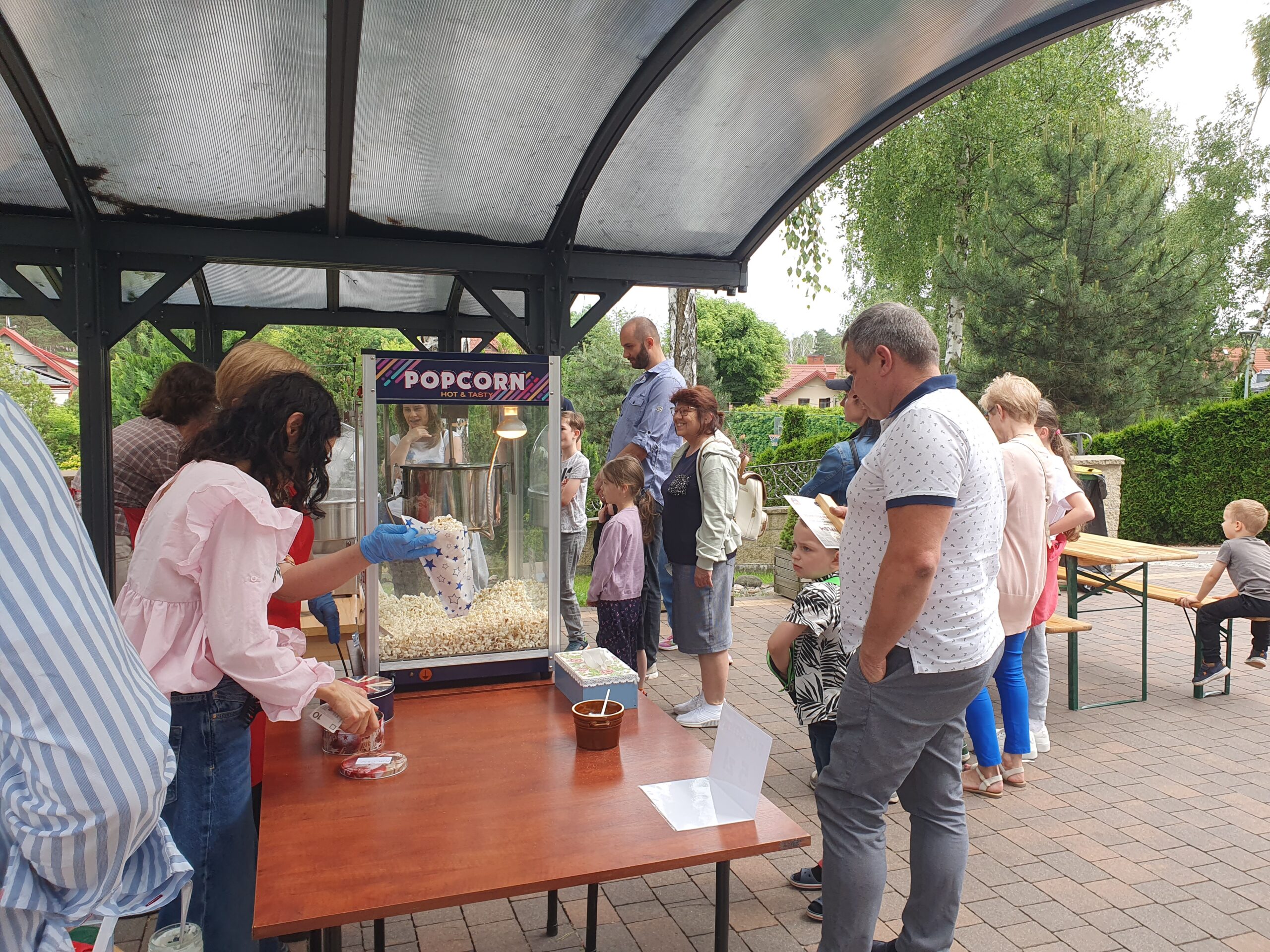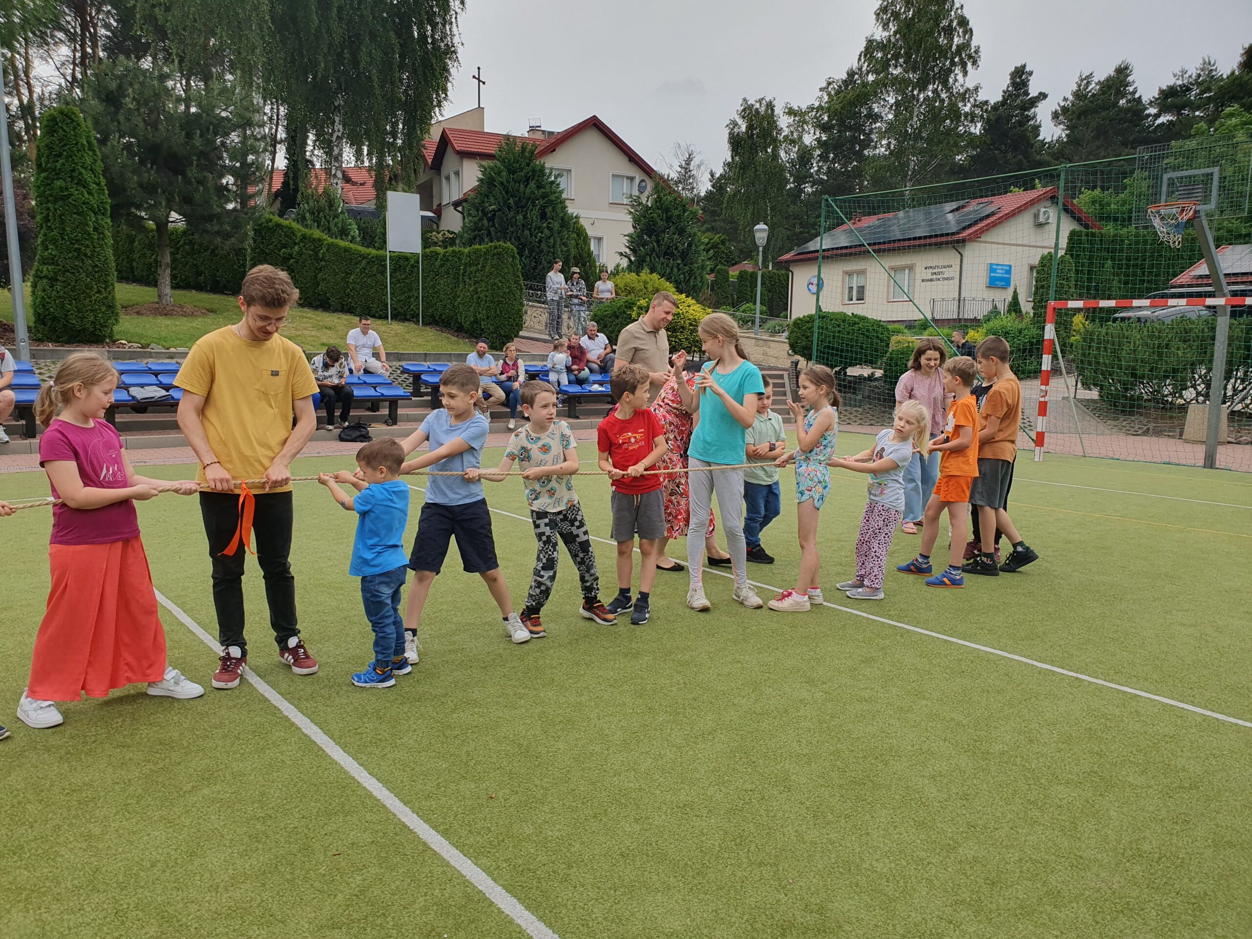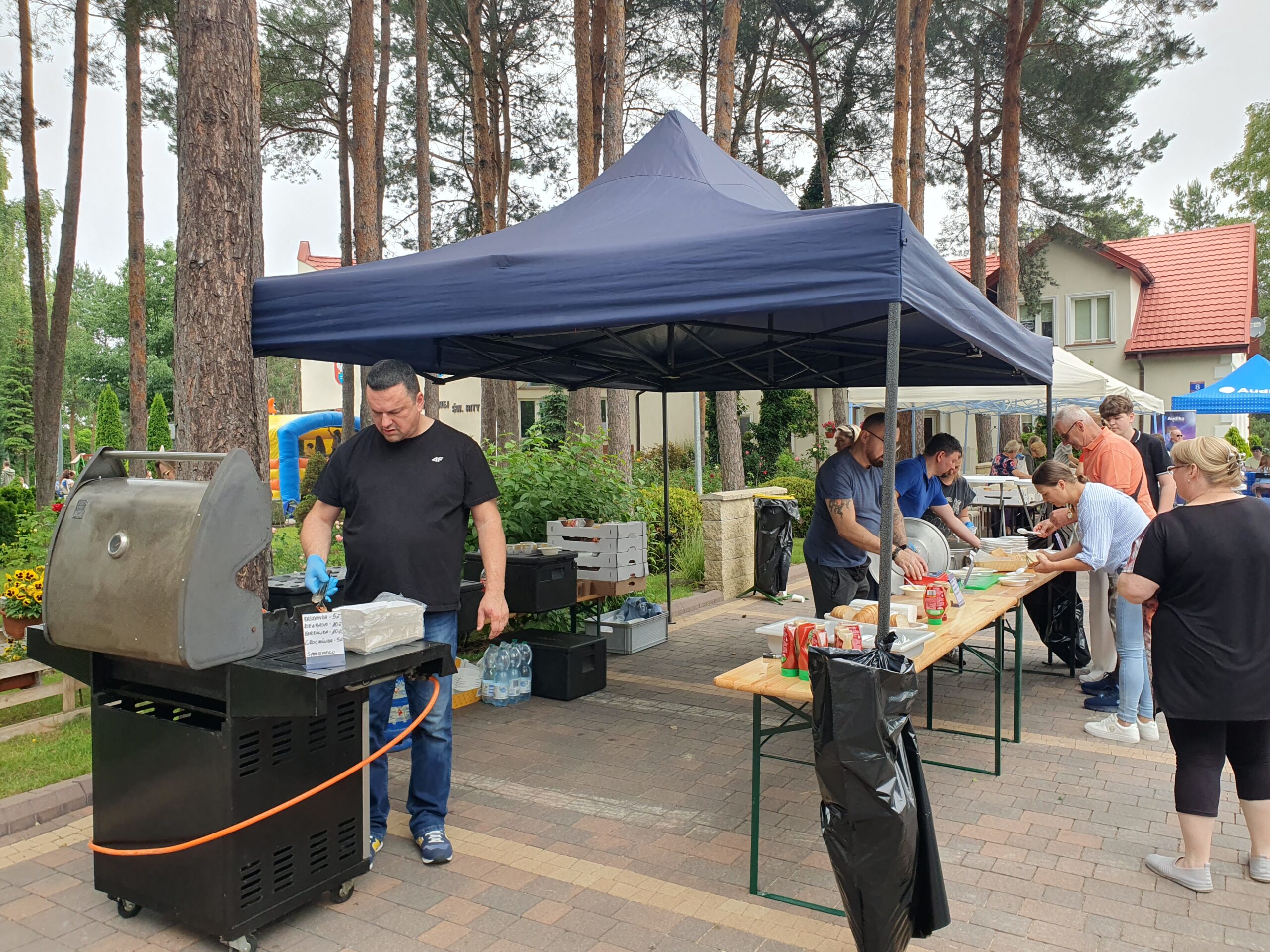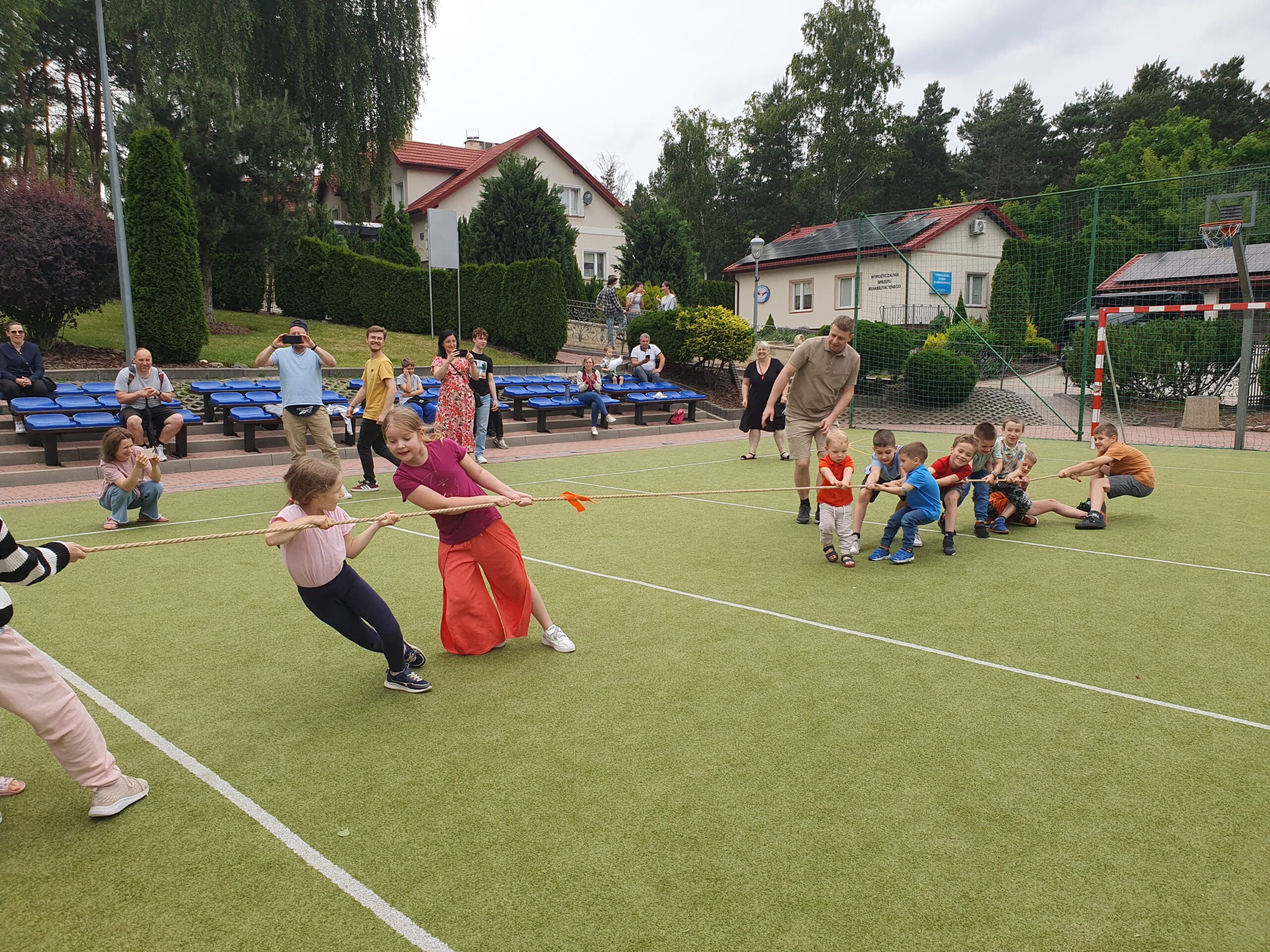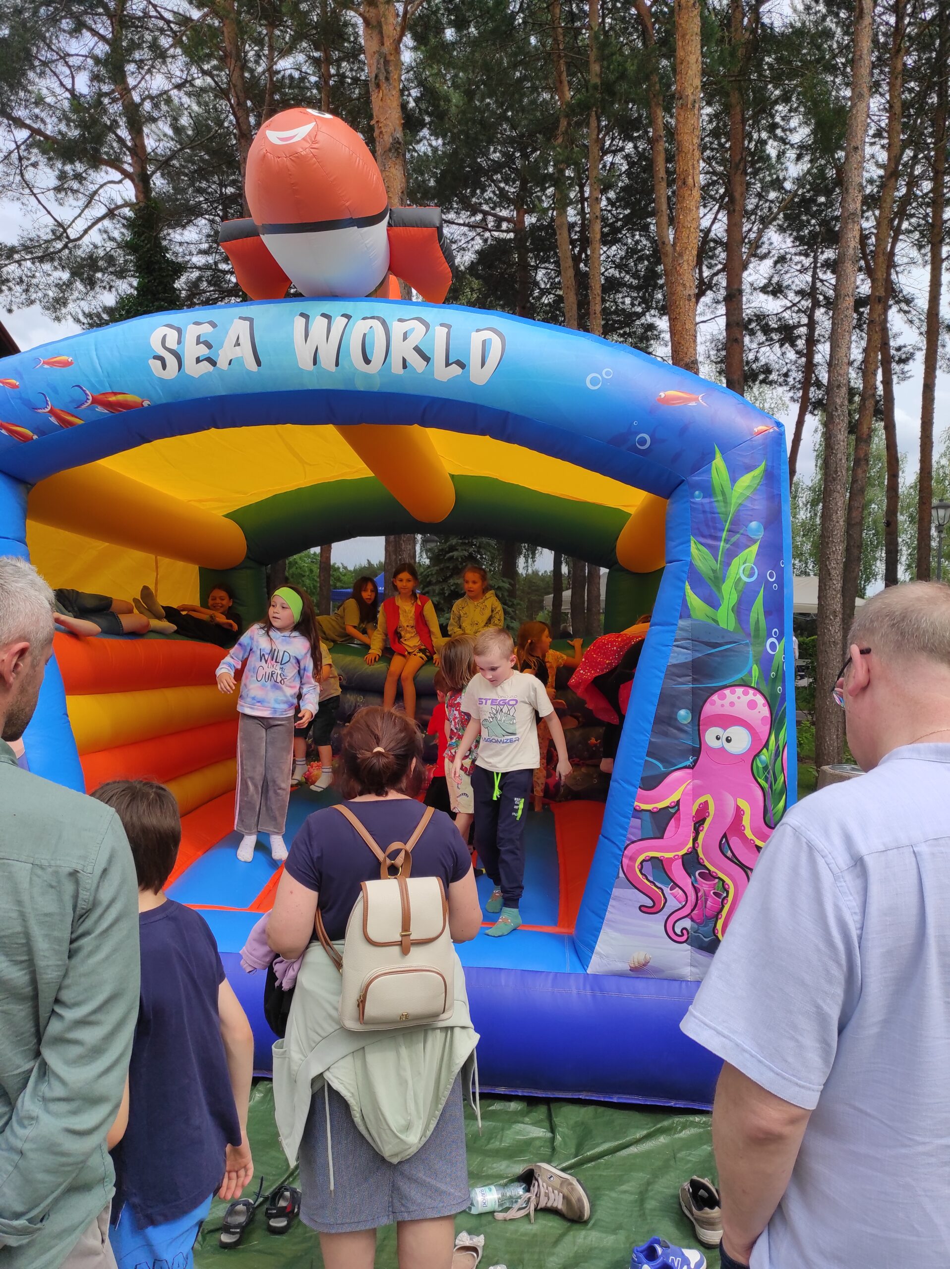 Nie zabrakło również stoisk kulinarnych (grochówka, kiełbaski, kaszanka, pizzerki) i oczywiście słodkości (wata cukrowa, popcorn, pączki, drożdżówki, lody, kawa i herbata). Dzieci z radością korzystały z dmuchańców – zjeżdżalni i trampolin, a na boisku rozgrywały się konkursy sportowe, w których można było zdobyć dyplomy i nagrody.