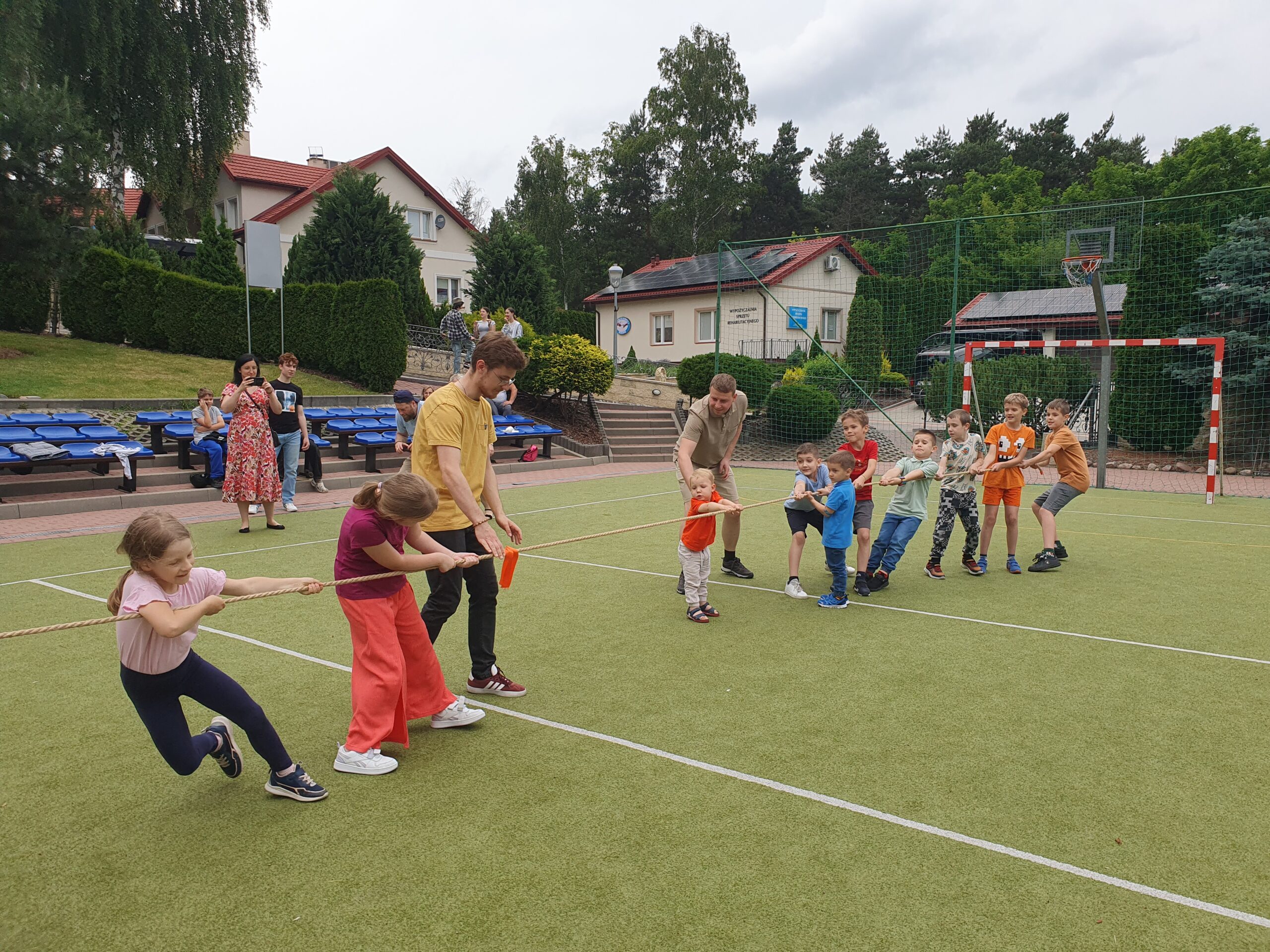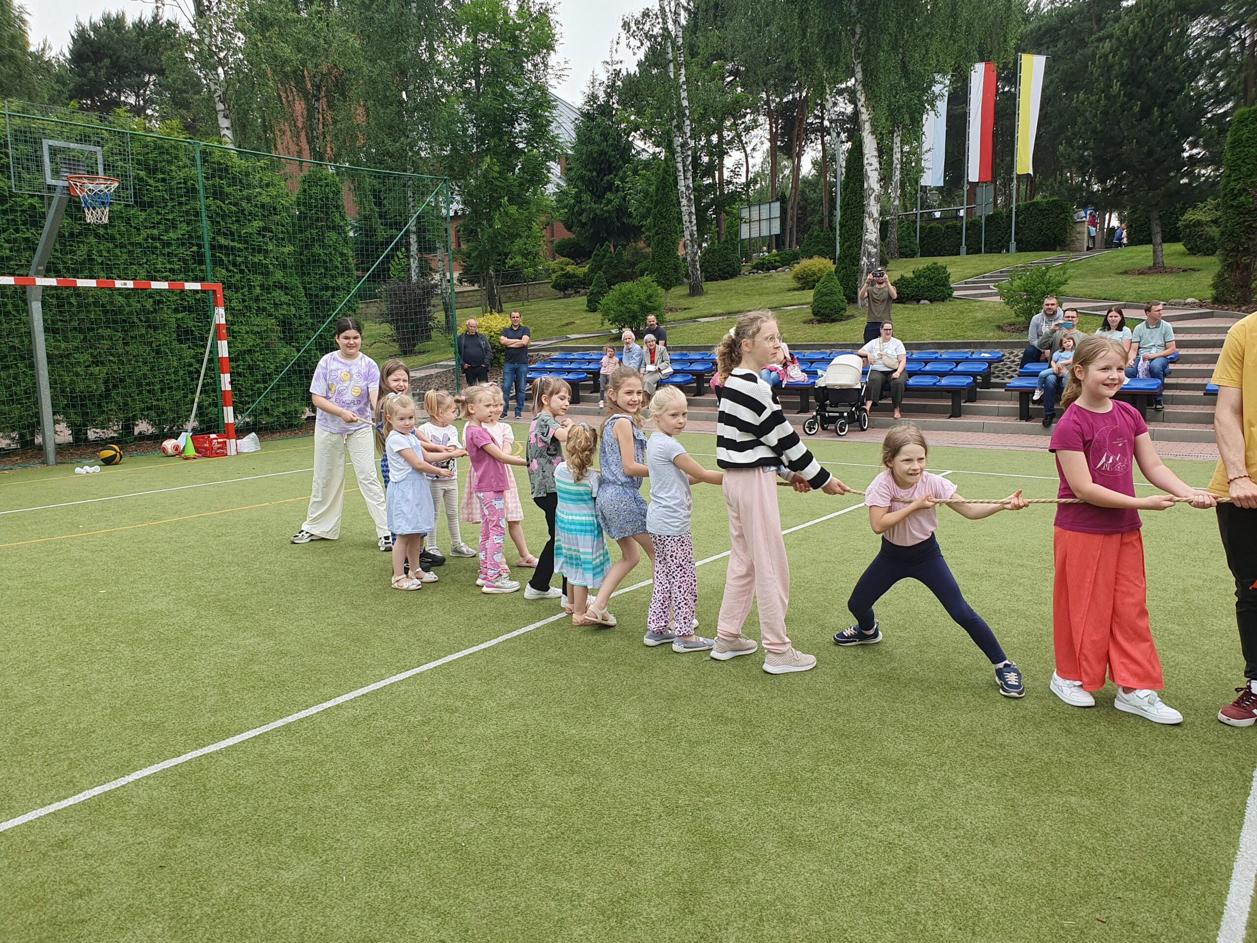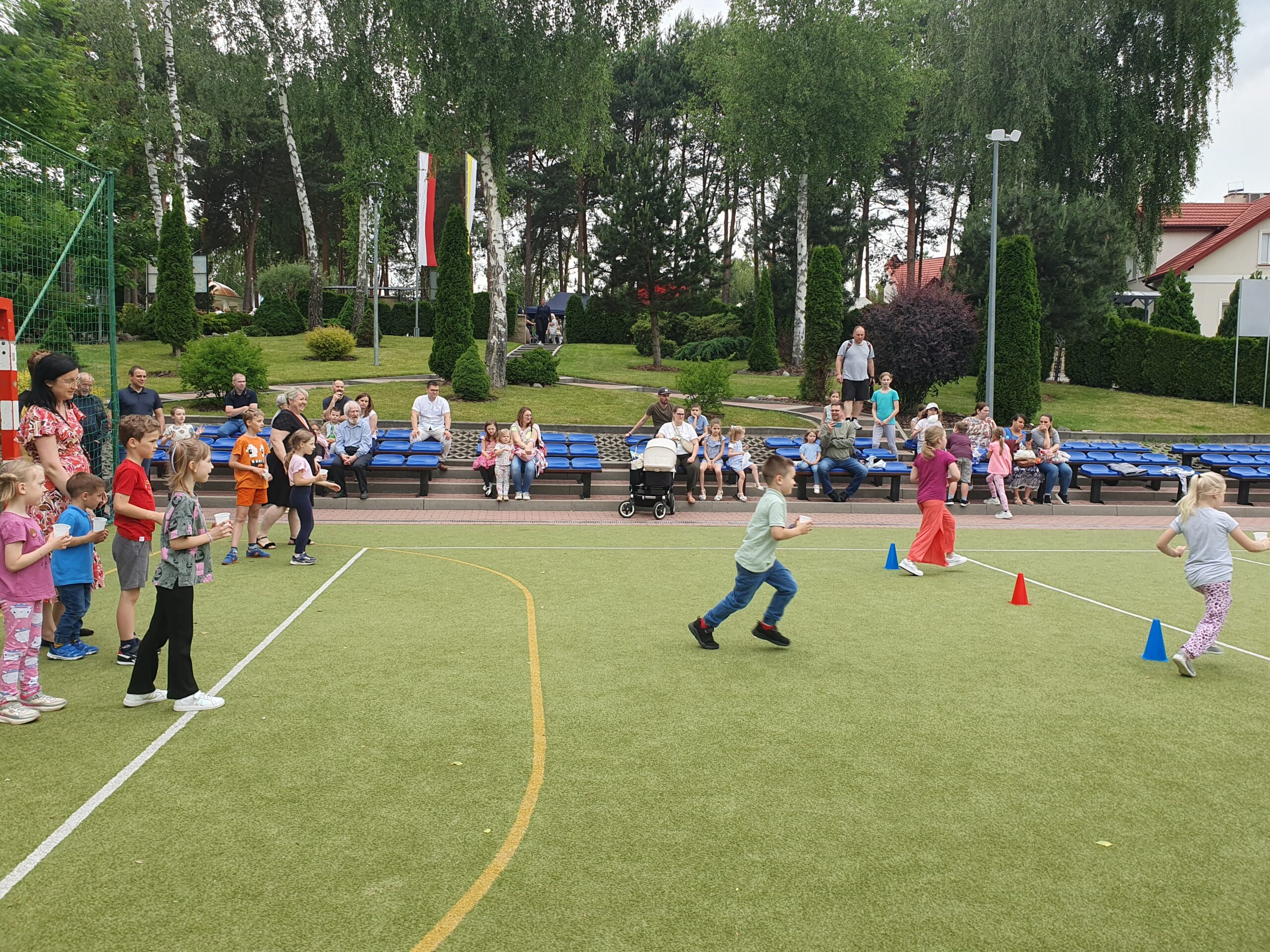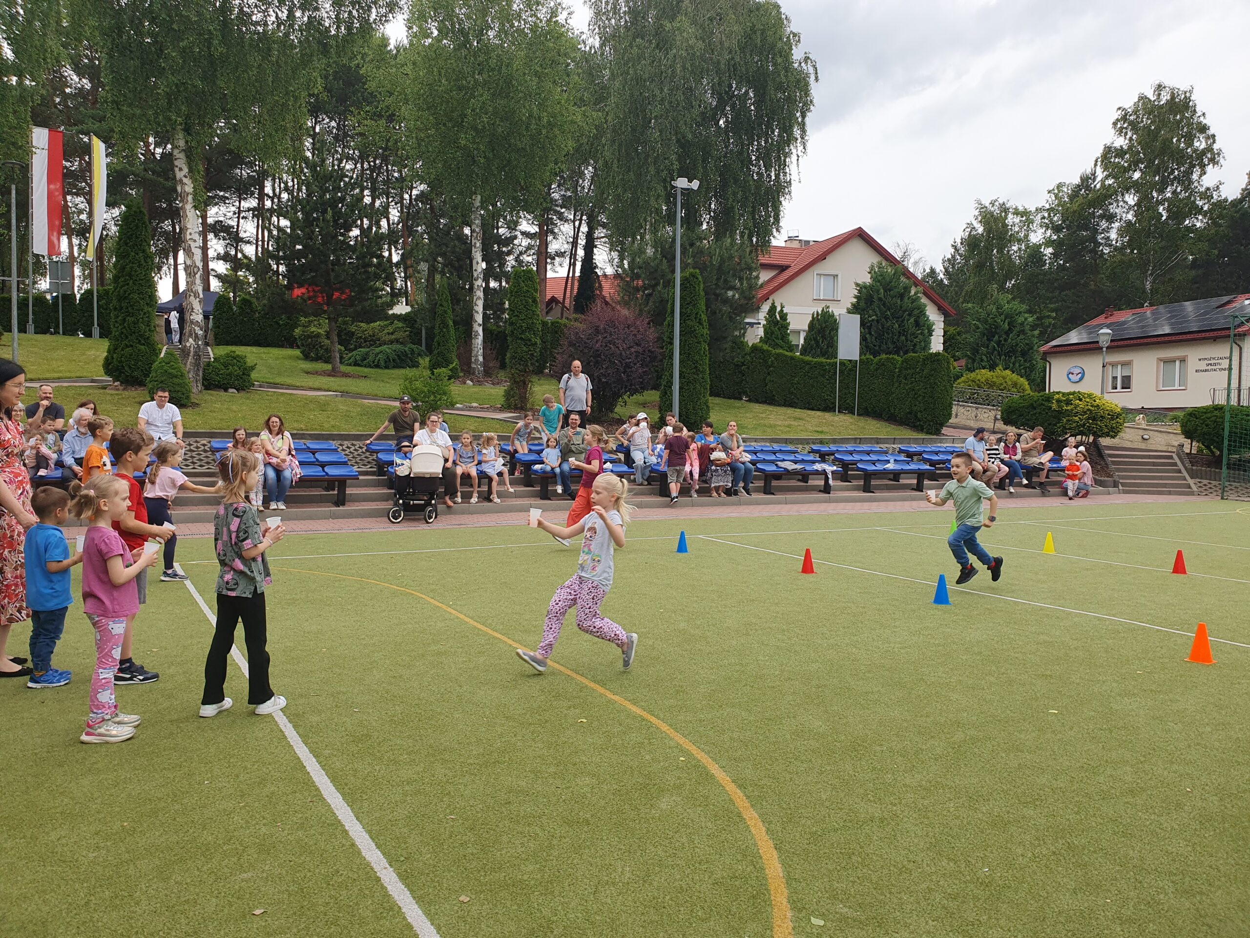 Nie zabrakło również stoisk kulinarnych (grochówka, kiełbaski, kaszanka, pizzerki) i oczywiście słodkości (wata cukrowa, popcorn, pączki, drożdżówki, lody, kawa i herbata). Dzieci z radością korzystały z dmuchańców – zjeżdżalni i trampolin, a na boisku rozgrywały się konkursy sportowe, w których można było zdobyć dyplomy i nagrody.