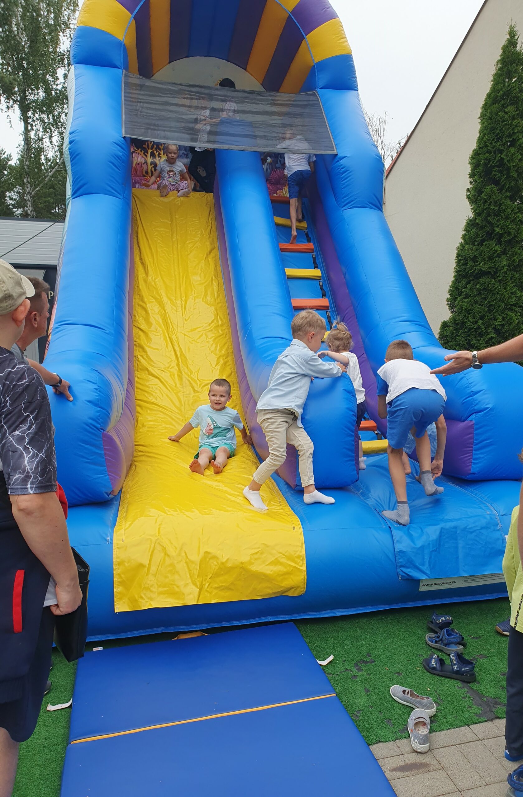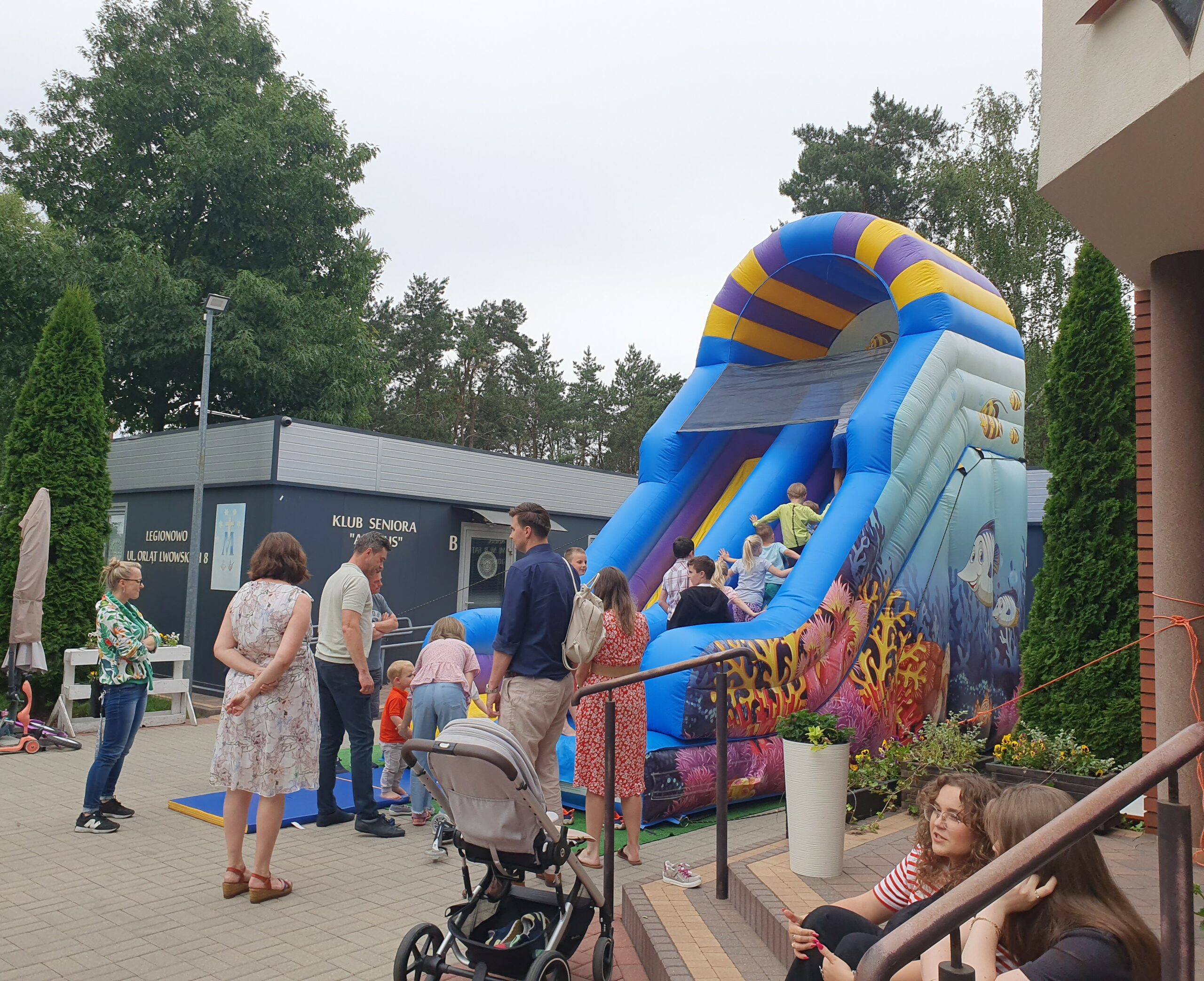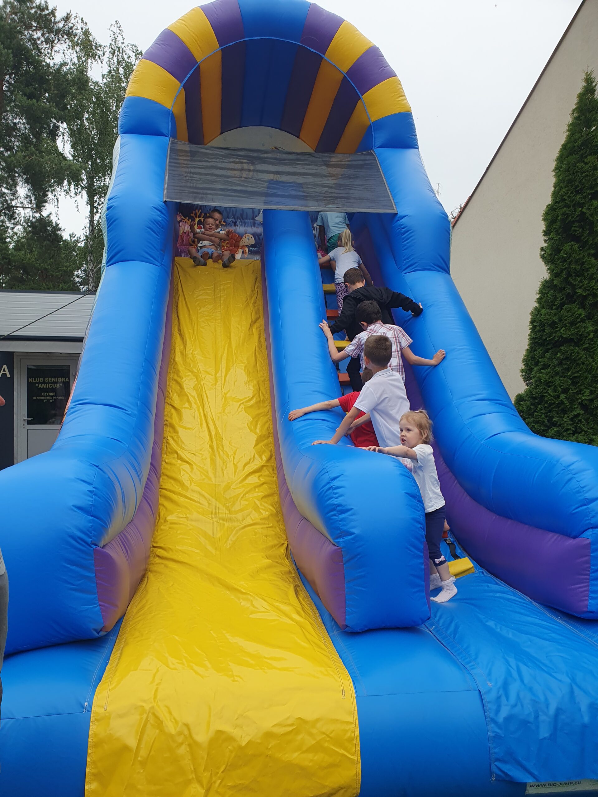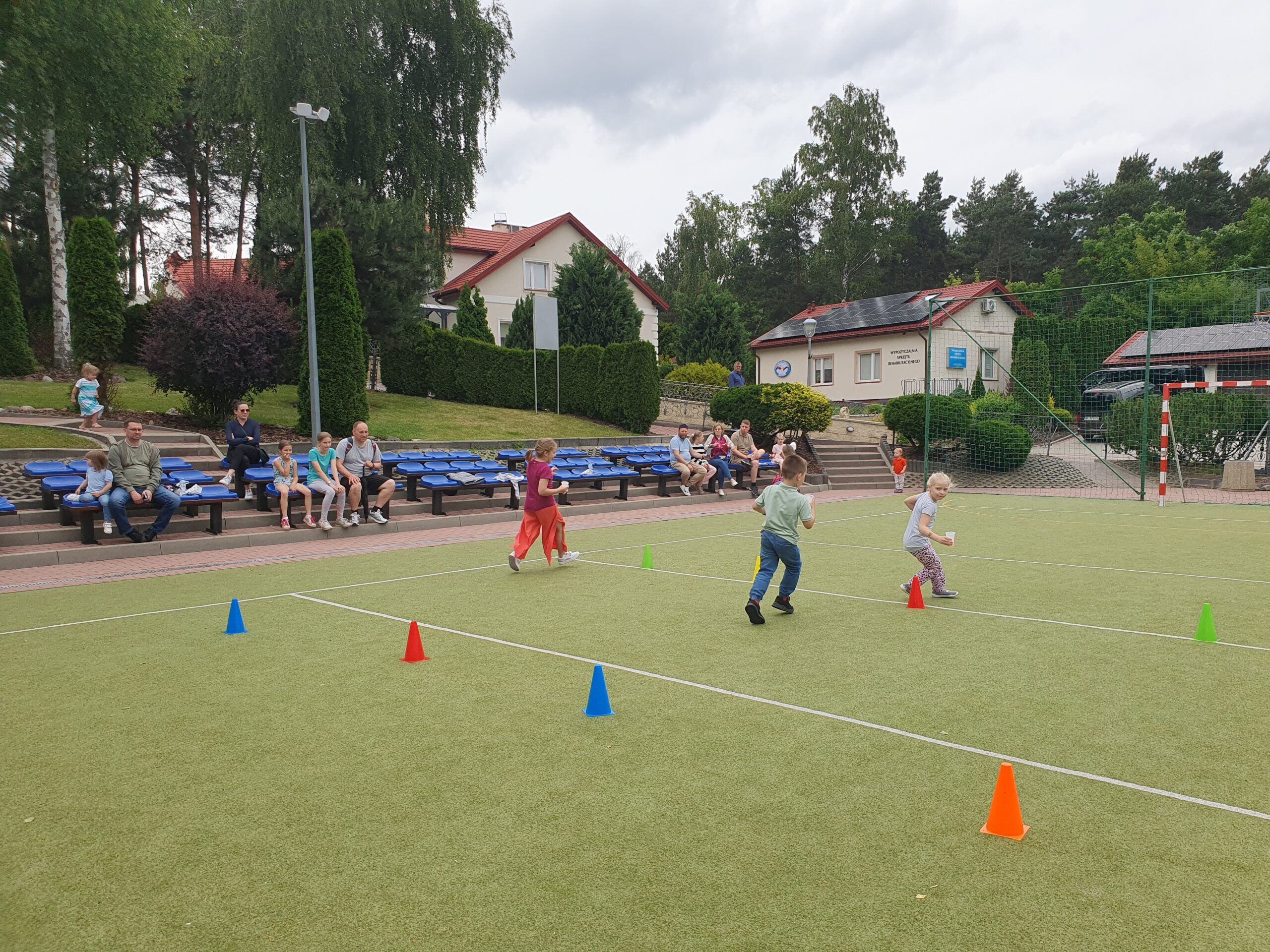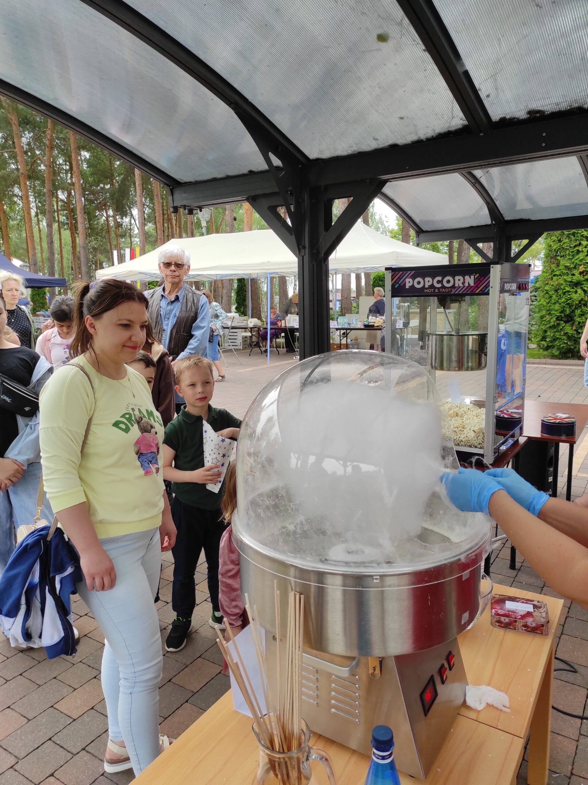 Nie zabrakło również stoisk kulinarnych (grochówka, kiełbaski, kaszanka, pizzerki) i oczywiście słodkości (wata cukrowa, popcorn, pączki, drożdżówki, lody, kawa i herbata). Dzieci z radością korzystały z dmuchańców – zjeżdżalni i trampolin, a na boisku rozgrywały się konkursy sportowe, w których można było zdobyć dyplomy i nagrody.