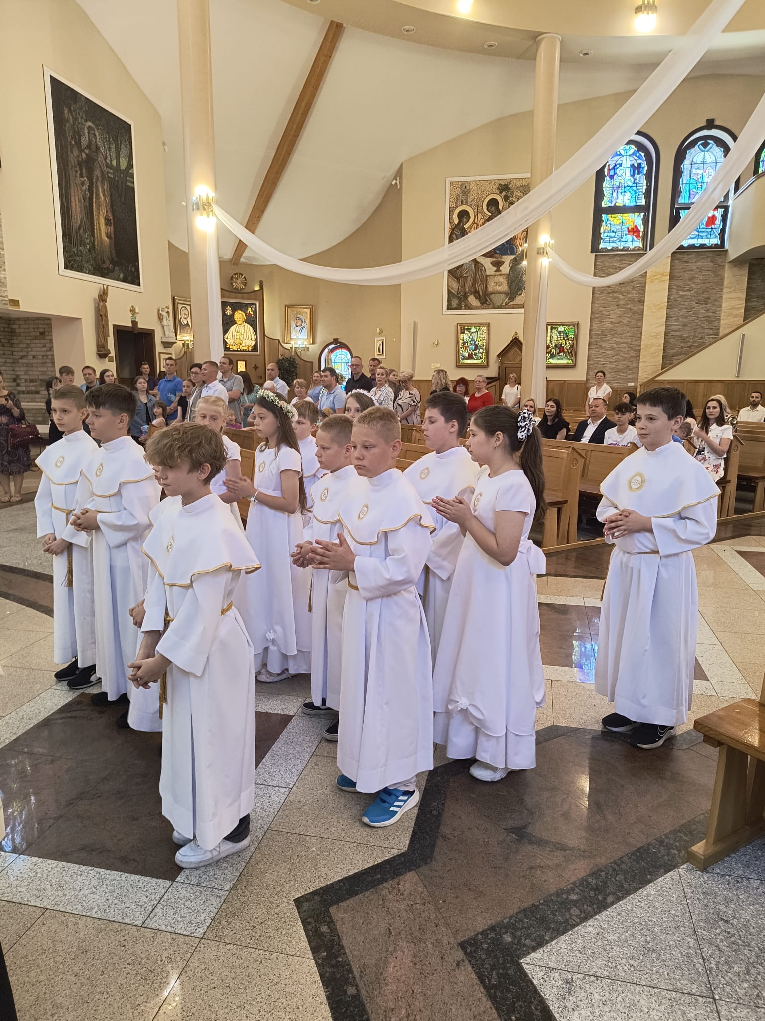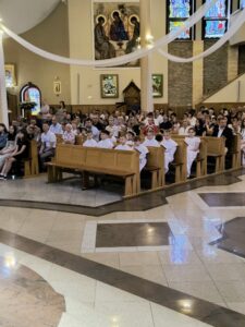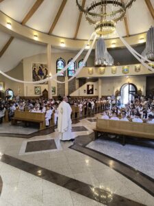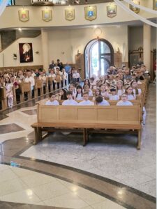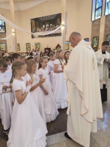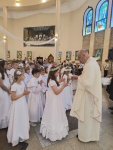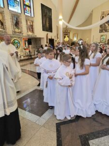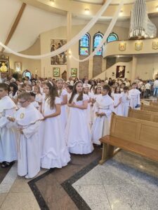 W niedzielę, Mszą świętą o godzinie 11.00, dzieci, które w tym roku przystąpiły do rocznicy I Komunii świętej i rocznicy, pragnęły podziękować za ten wyjątkowy czas. Wspólna Eucharystia była okazją dla dzieci do spojrzenia na siebie nawzajem, dla jednych, jak przystępowali do Komunii rok temu a dla drugich, co ich czeka za rok. Na koniec Mszy świętej obie grupy otrzymały pamiątkowe świece, które mają im przypominać to niezwykłe wydarzenie, oraz zachęcać do podtrzymywania w swoim życiu płomienia wiary.