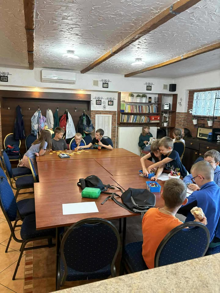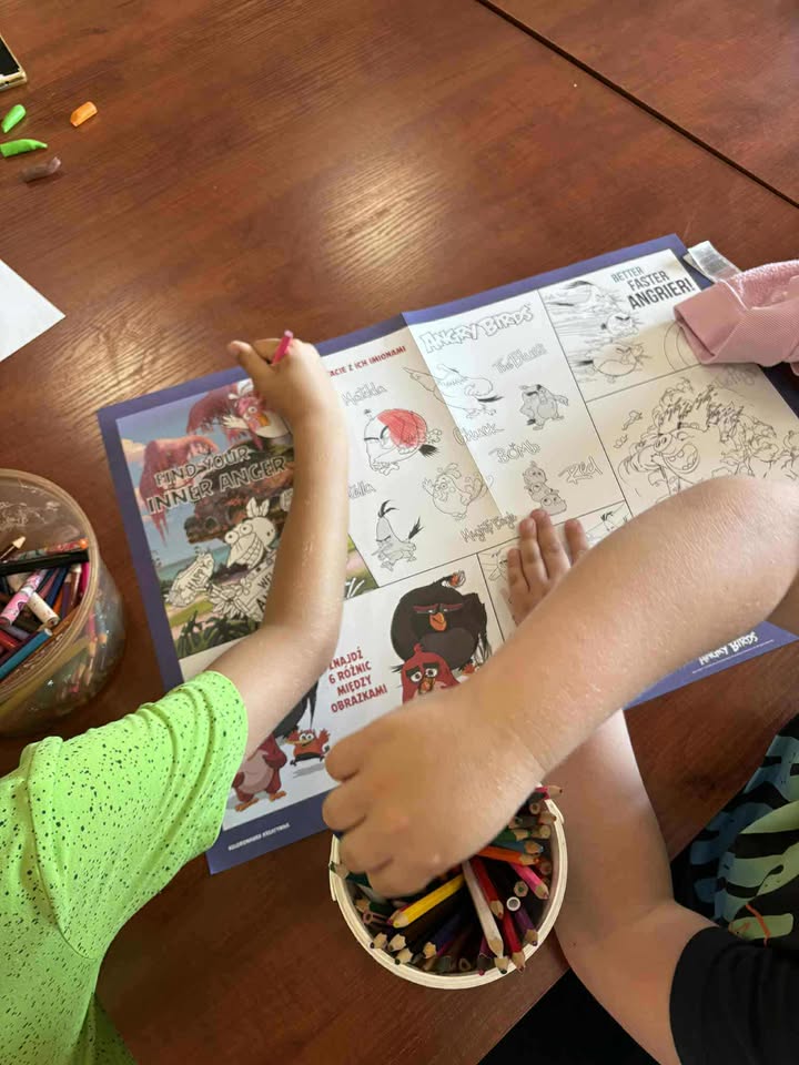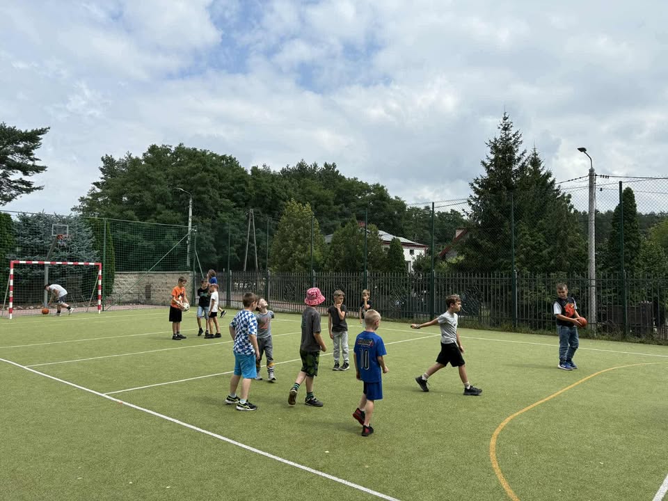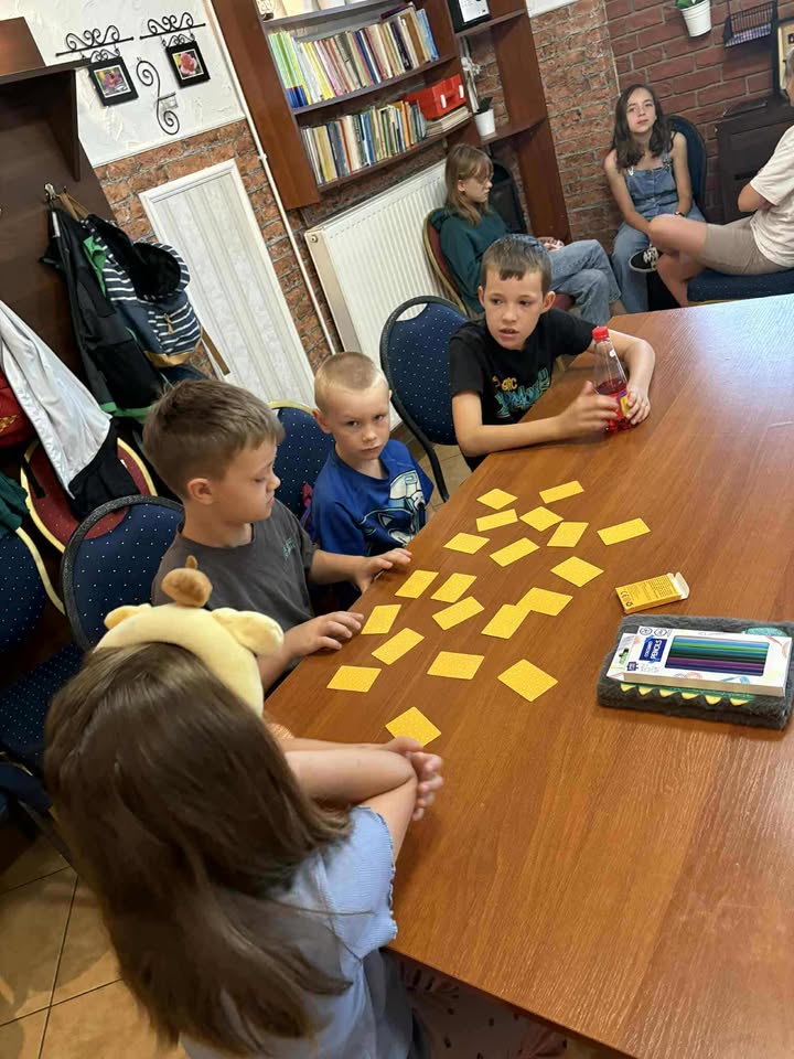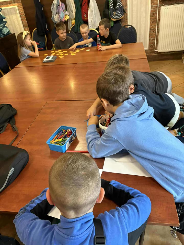 W ostatnim tygodniu lipca na świetlicy działo się naprawdę sporo. Dzieci codziennie bawiły się na świeżym powietrzu oraz uczestniczyły w zajęciach plastycznych. Dużym zainteresowaniem cieszyła się zabawa polegająca na wspólnym tworzeniu rysunków – co 30 sekund dzieci przekazywały sobie kartkę, dorysowując coś do wcześniej zaczętego obrazka. W ten sposób powstawały niezwykle kreatywne dzieła.