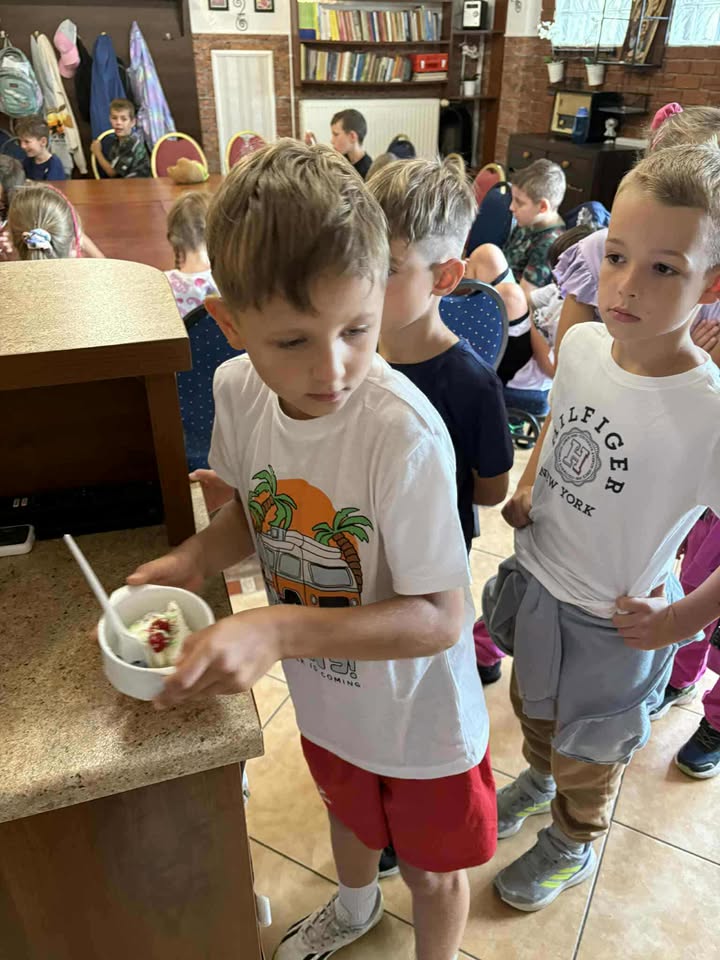 We wtorek na dzieci czekała słodka niespodzianka – mogły delektować się pysznym deserem lodowym. W czwartek podopieczni świetlicy odwiedzili Muzeum Wojska Polskiego, gdzie z zainteresowaniem oglądali mundury, broń i pojazdy wojskowe z różnych epok. Była to ciekawa i pełna wrażeń lekcja historii.