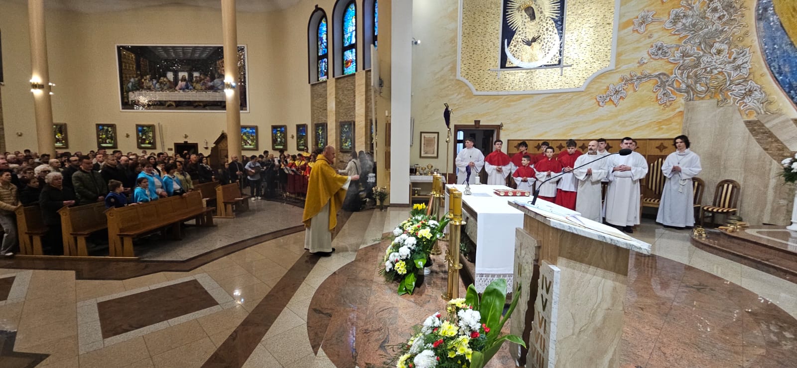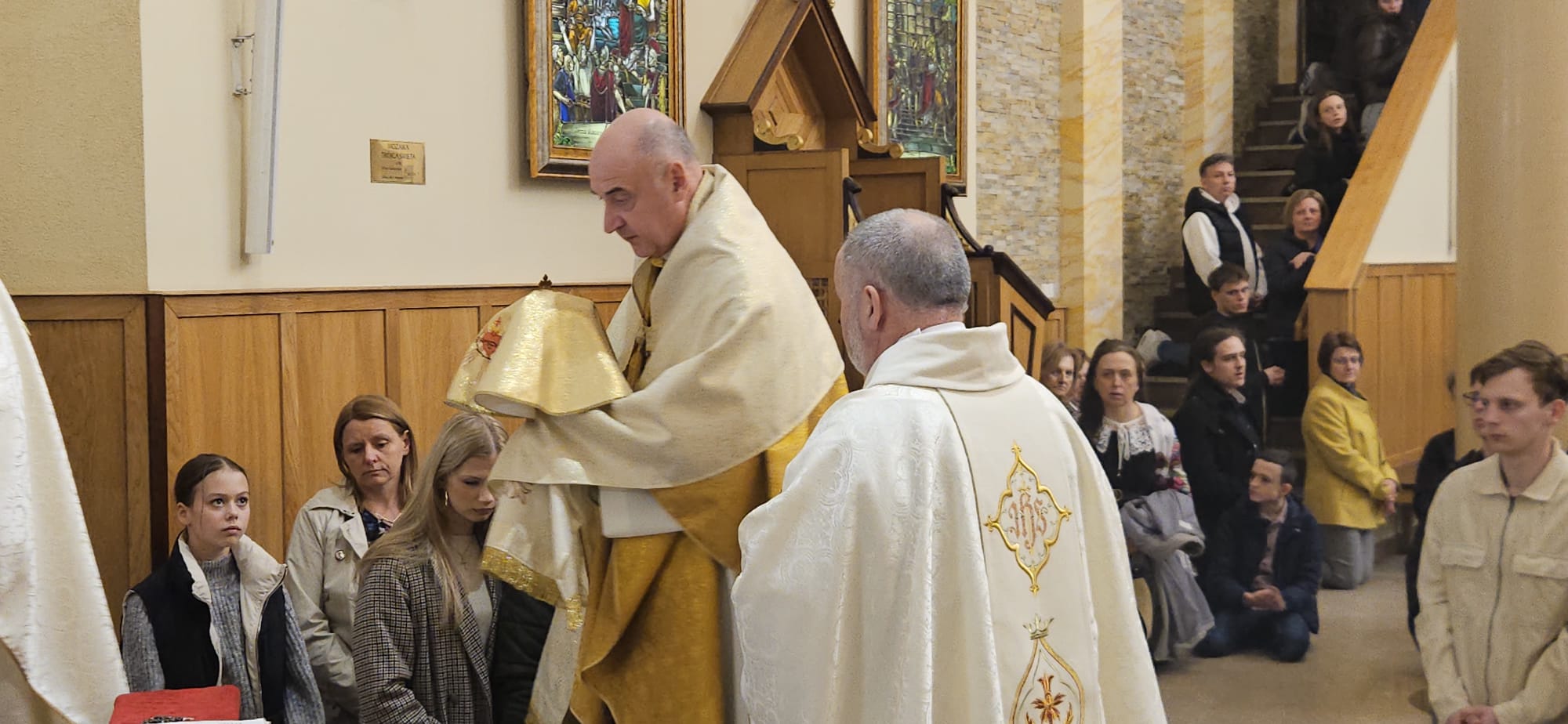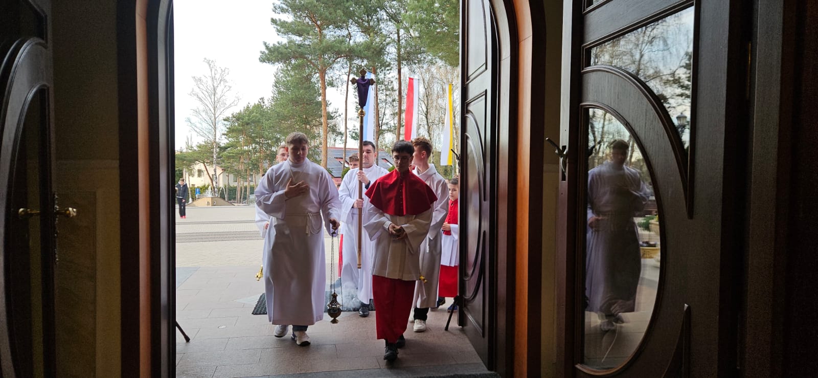 O godzinie 18:00 zgromadziliśmy się w naszym parafialnym wieczerniku, aby nie tylko wspominać wydarzenie Wielkiego Czwartku, ale by dziękować za dary eucharystii i kapłaństwa, że Chrystus został z nami tak blisko, że może zamieszkać w sanktuarium naszego serca. Mszę świętą Wieczerzy Pańskiej sprawowali ks. Proboszcz, ks. Mikołaj i ks. Arkadiusz. W wielkim gronie parafian, wspólnot i grup parafialnych dziękowali za dar powołania, kapłaństwa i każdego z nas których obejmuje swoją troską duszpasterską. Eucharystia jest tajemnicą nowego baranka- Jezusa Chrystusa. Mamy go spożywać, a jego krew ma nas bronić przed współczesnym aniołem śmierci, który tak często przechodzi przez nasze życie i chce nas uśmiercić. To kapłan jest tym, który pomaga nam by ten anioł nie wkradł się do naszego wnętrza i nas duchowo nie uśmiercił.